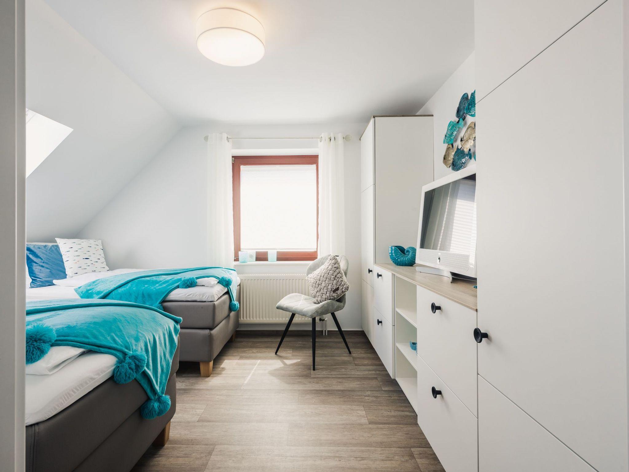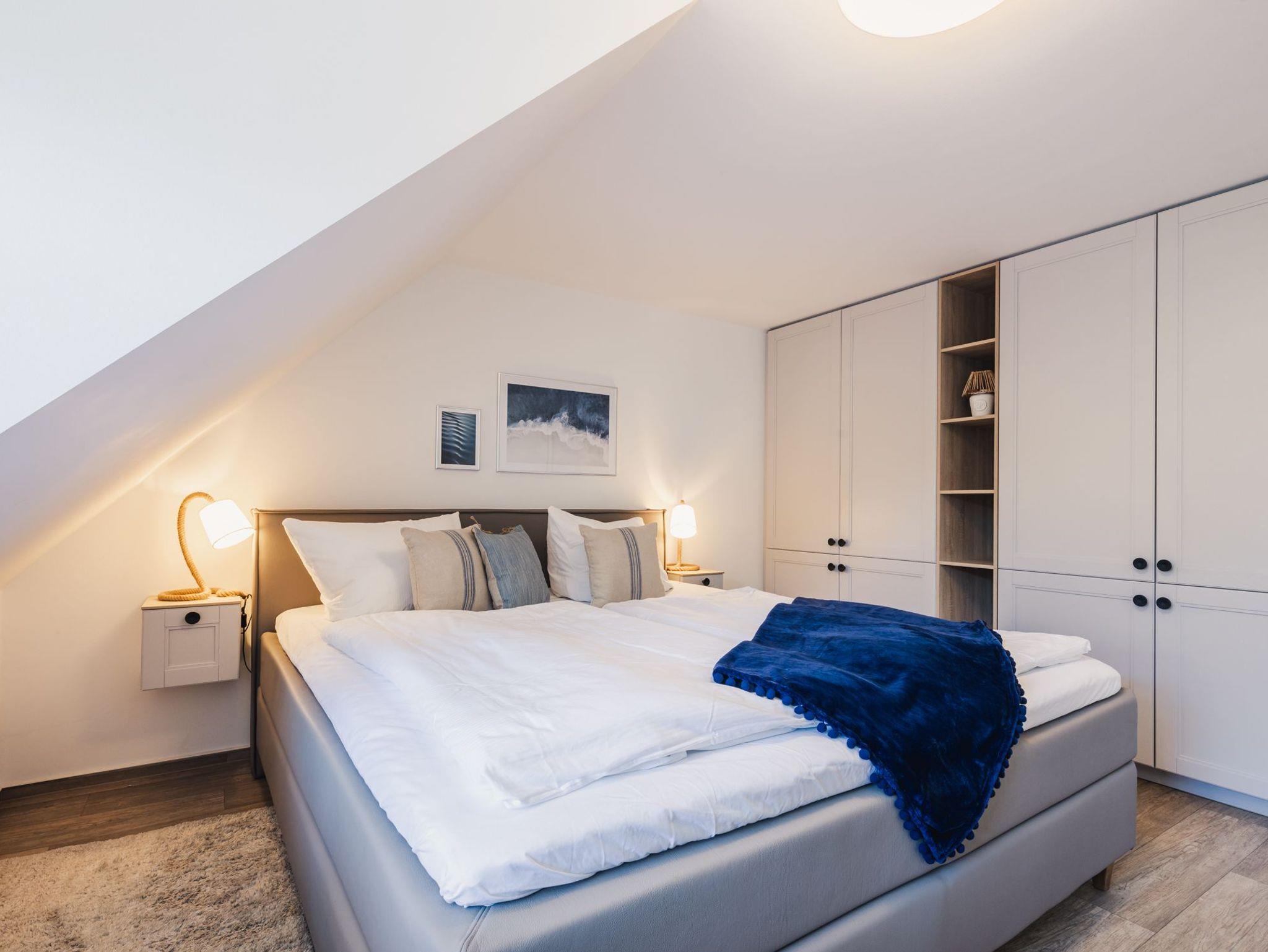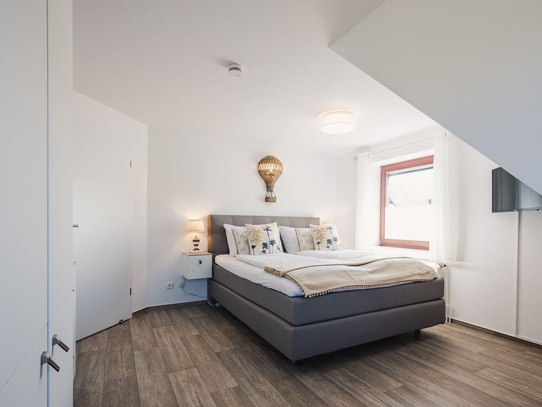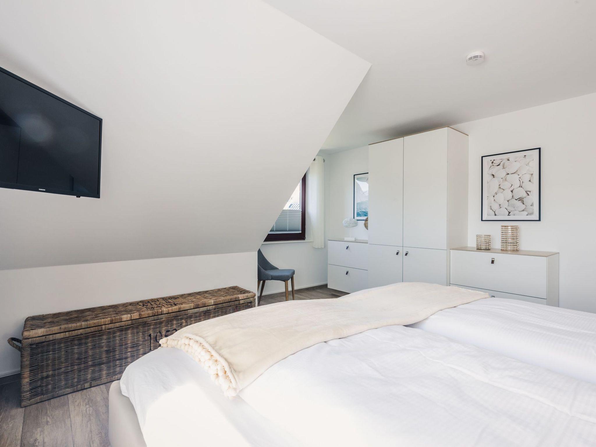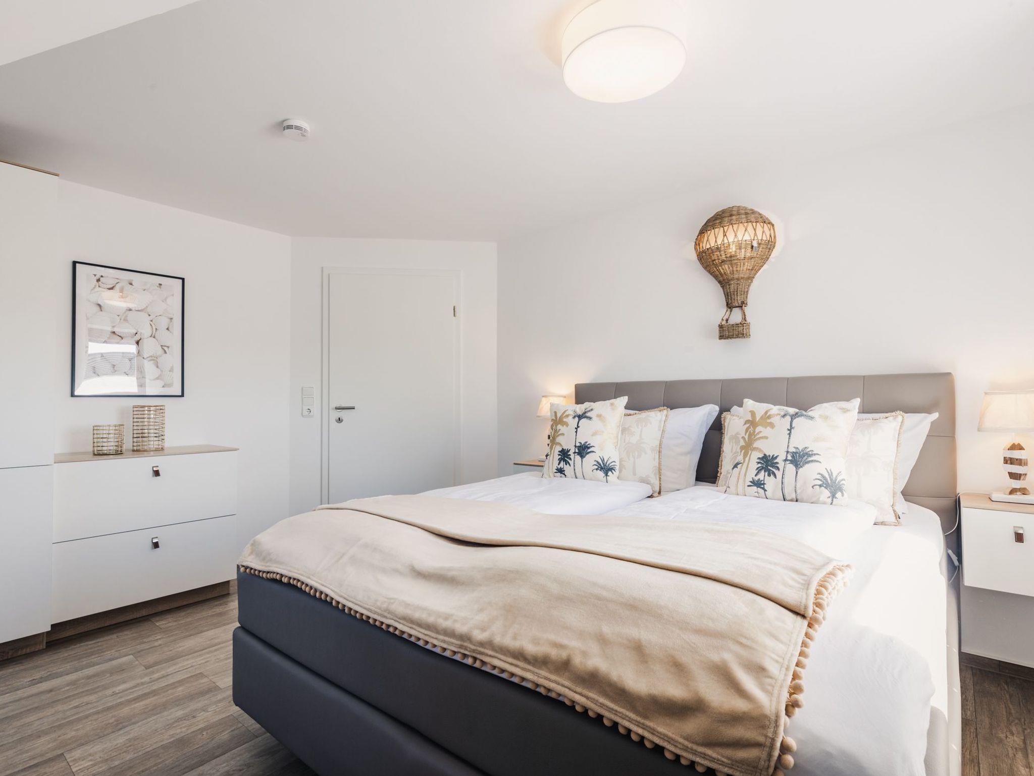 Das Obergeschoss überrascht mit drei ganz unterschiedlich designten Schlafzimmern, wobei alle Schlafzimmer mit Boxspringbetten und Fernseher ausgestattet sind. Ebenfalls auf dieser Ebene befindet sich das voll eingerichtete Badezimmer mit freistehender Badewanne und großem Dachfenster für einen direkten Blick in den Wolken- oder Sternenhimmel.
