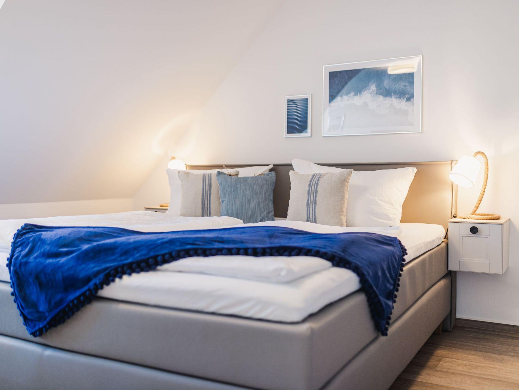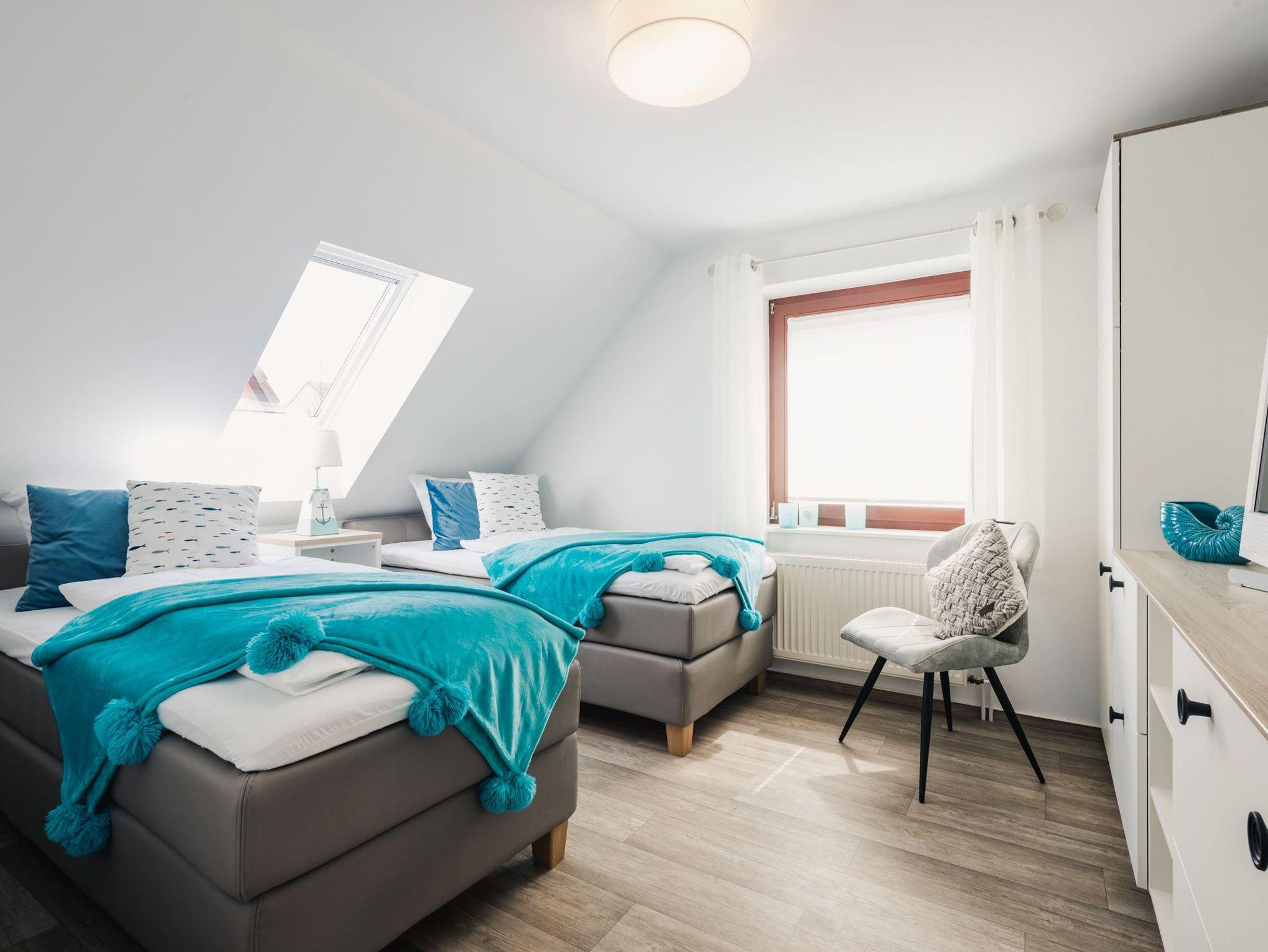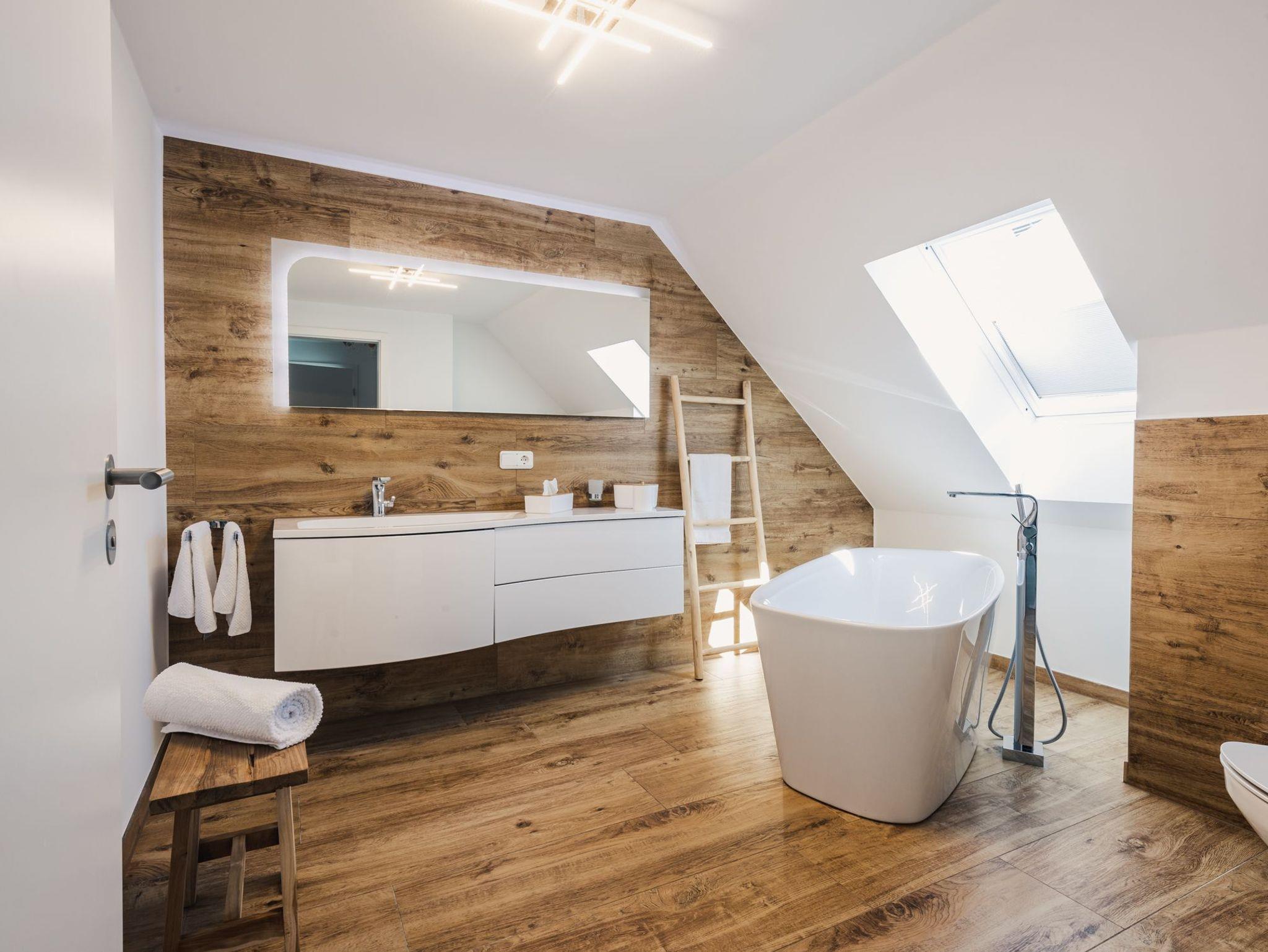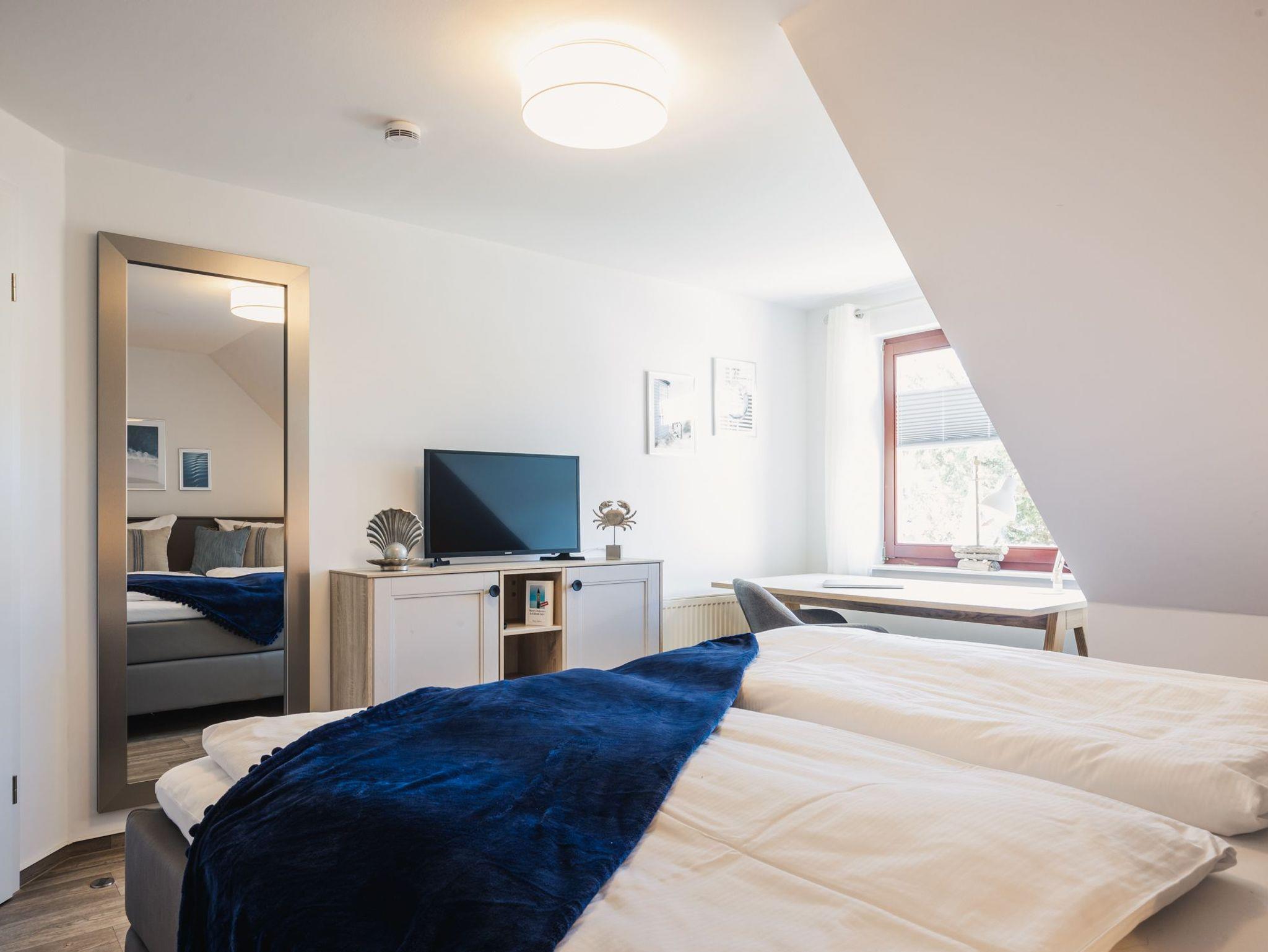 Das Obergeschoss überrascht mit drei ganz unterschiedlich designten Schlafzimmern, wobei alle Schlafzimmer mit Boxspringbetten und Fernseher ausgestattet sind. Ebenfalls auf dieser Ebene befindet sich das voll eingerichtete Badezimmer mit freistehender Badewanne und großem Dachfenster für einen direkten Blick in den Wolken- oder Sternenhimmel.