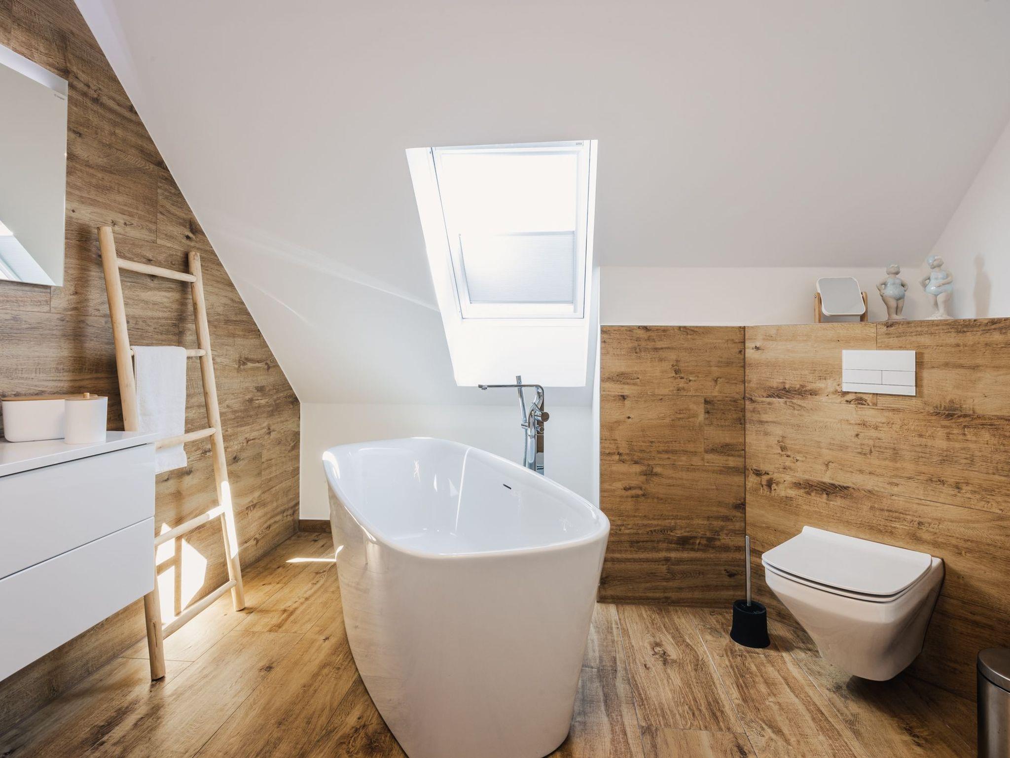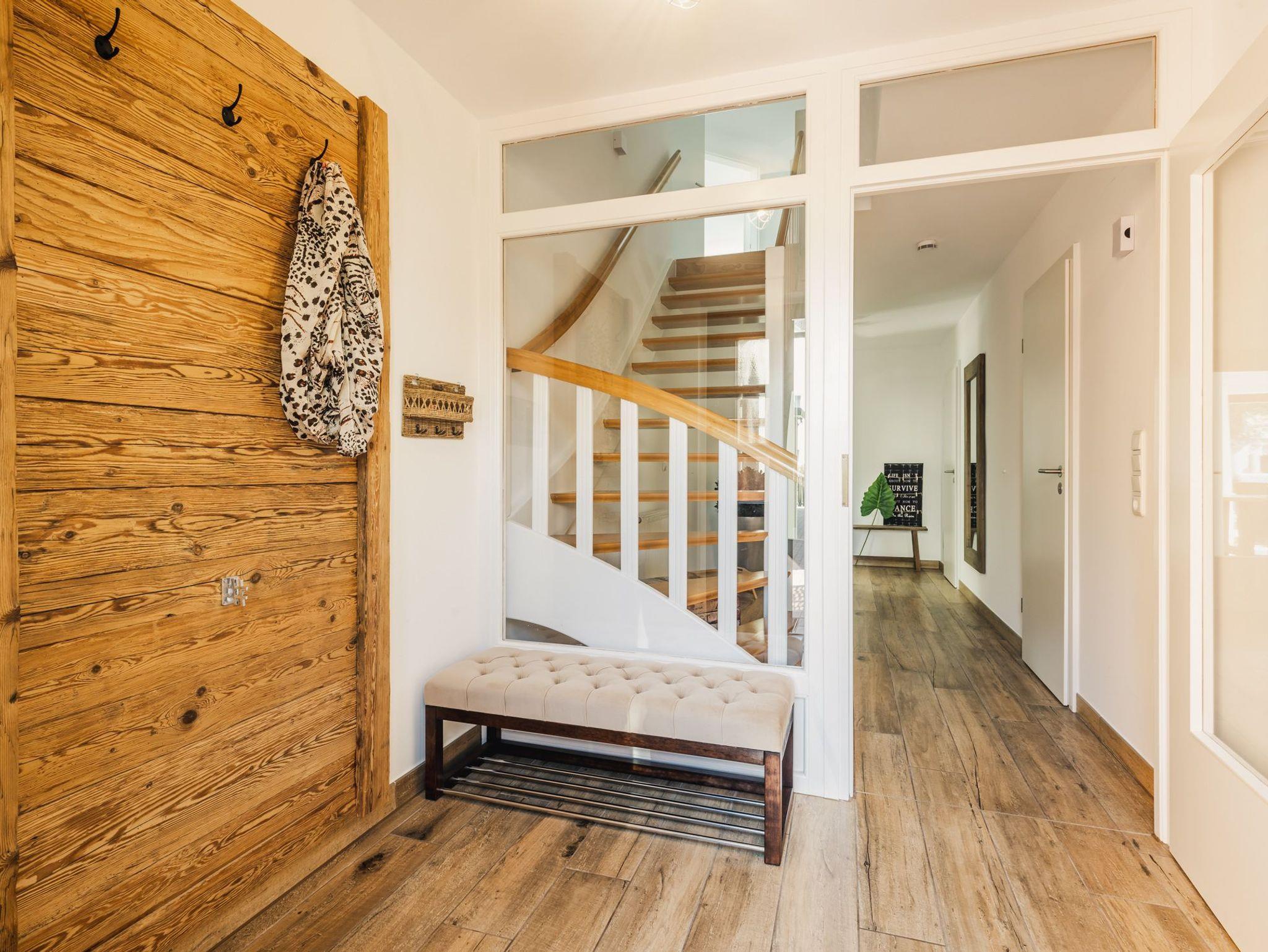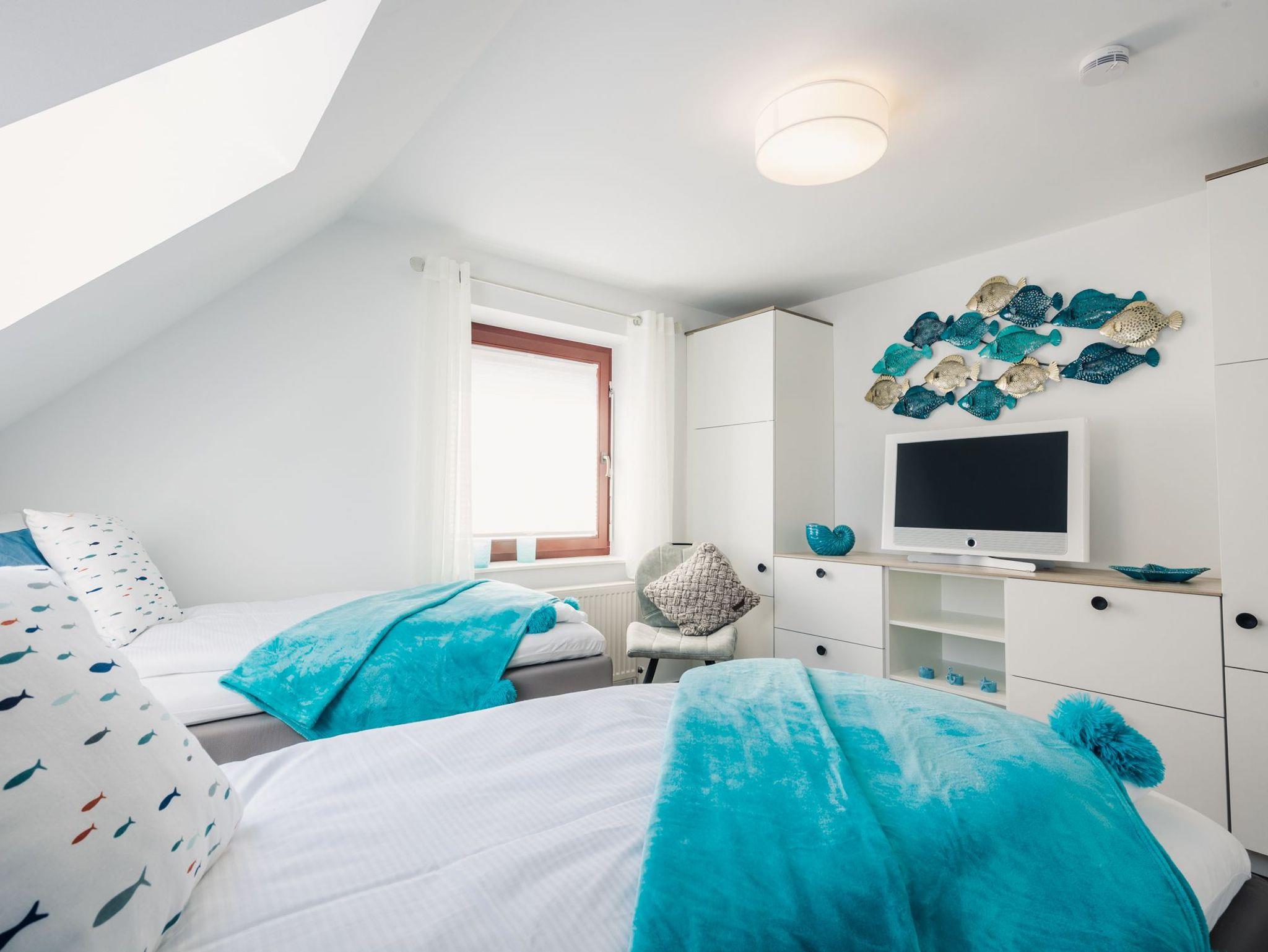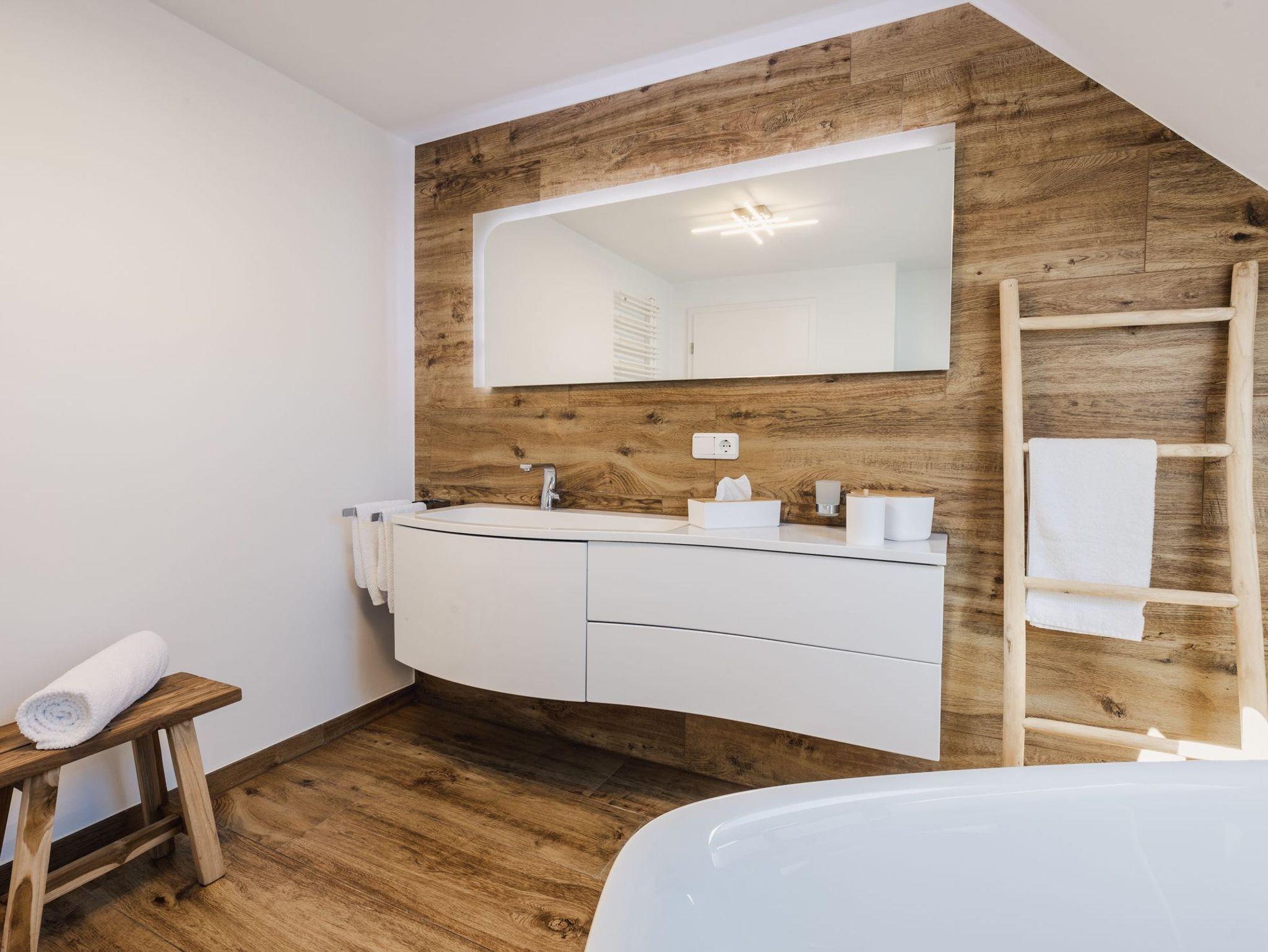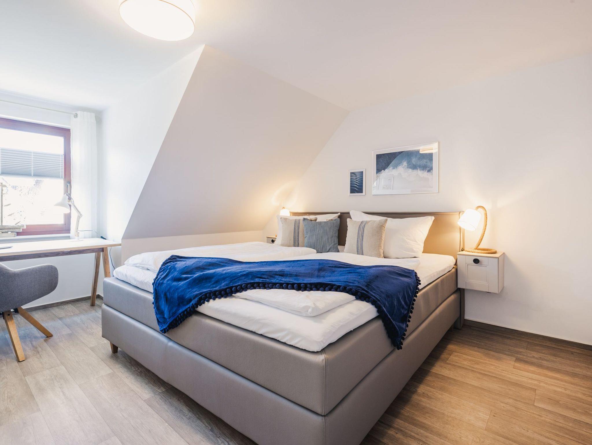 Das Obergeschoss überrascht mit drei ganz unterschiedlich designten Schlafzimmern, wobei alle Schlafzimmer mit Boxspringbetten und Fernseher ausgestattet sind. Ebenfalls auf dieser Ebene befindet sich das voll eingerichtete Badezimmer mit freistehender Badewanne und großem Dachfenster für einen direkten Blick in den Wolken- oder Sternenhimmel.