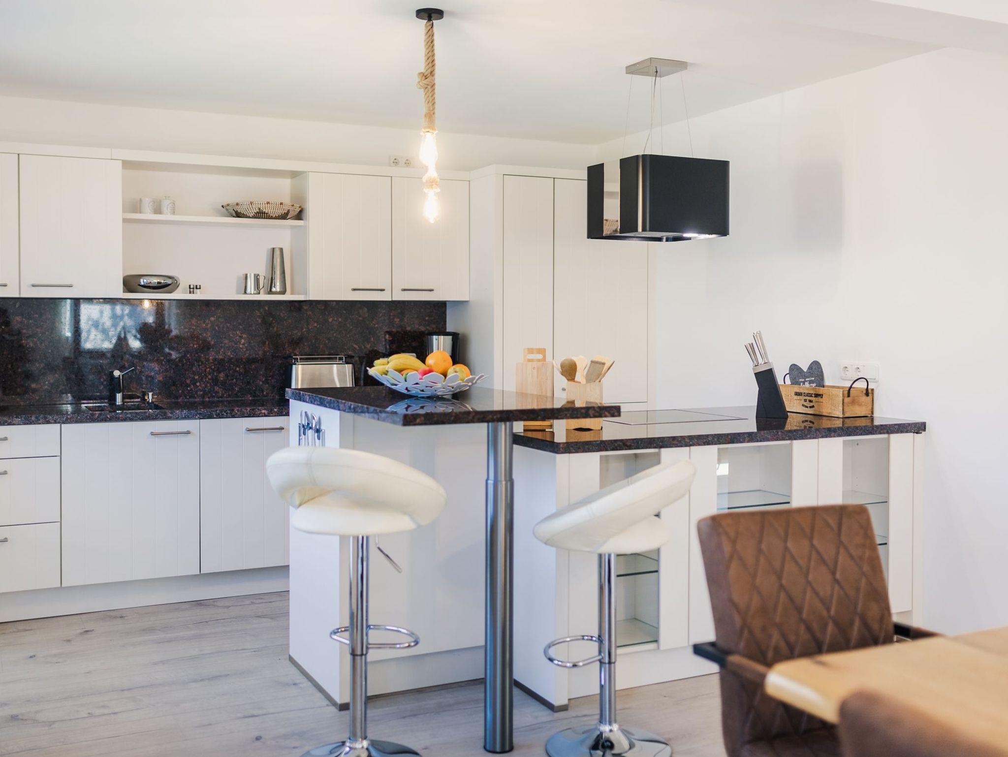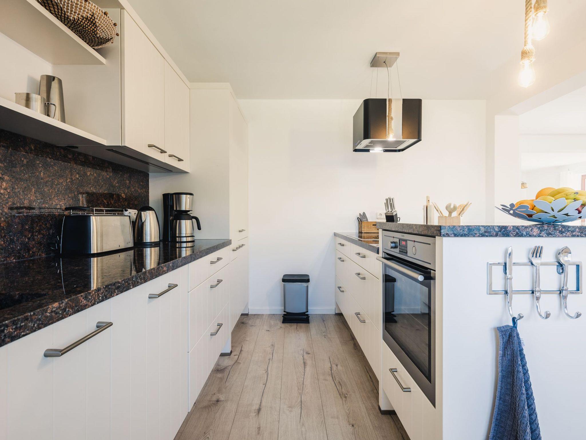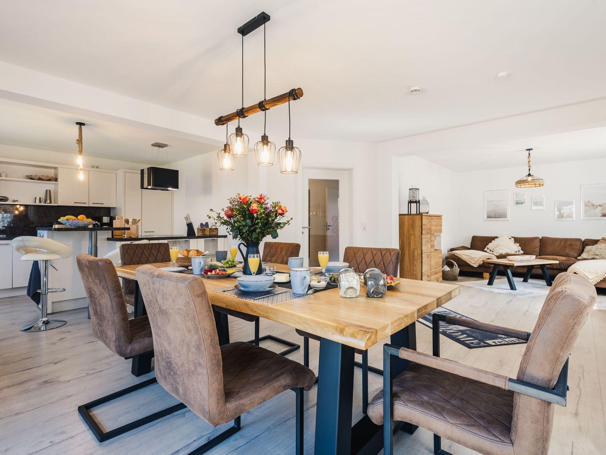 Während die offene Küche eine lückenlose Ausstattung und vollen Urlaubskomfort bietet, laden Esstisch und gemütliche Sitzlandschaft zum Verweilen ein. Ein zusätzliches Badezimmer mit WC & Dusche runden den Komfort im Erdgeschoss ab.