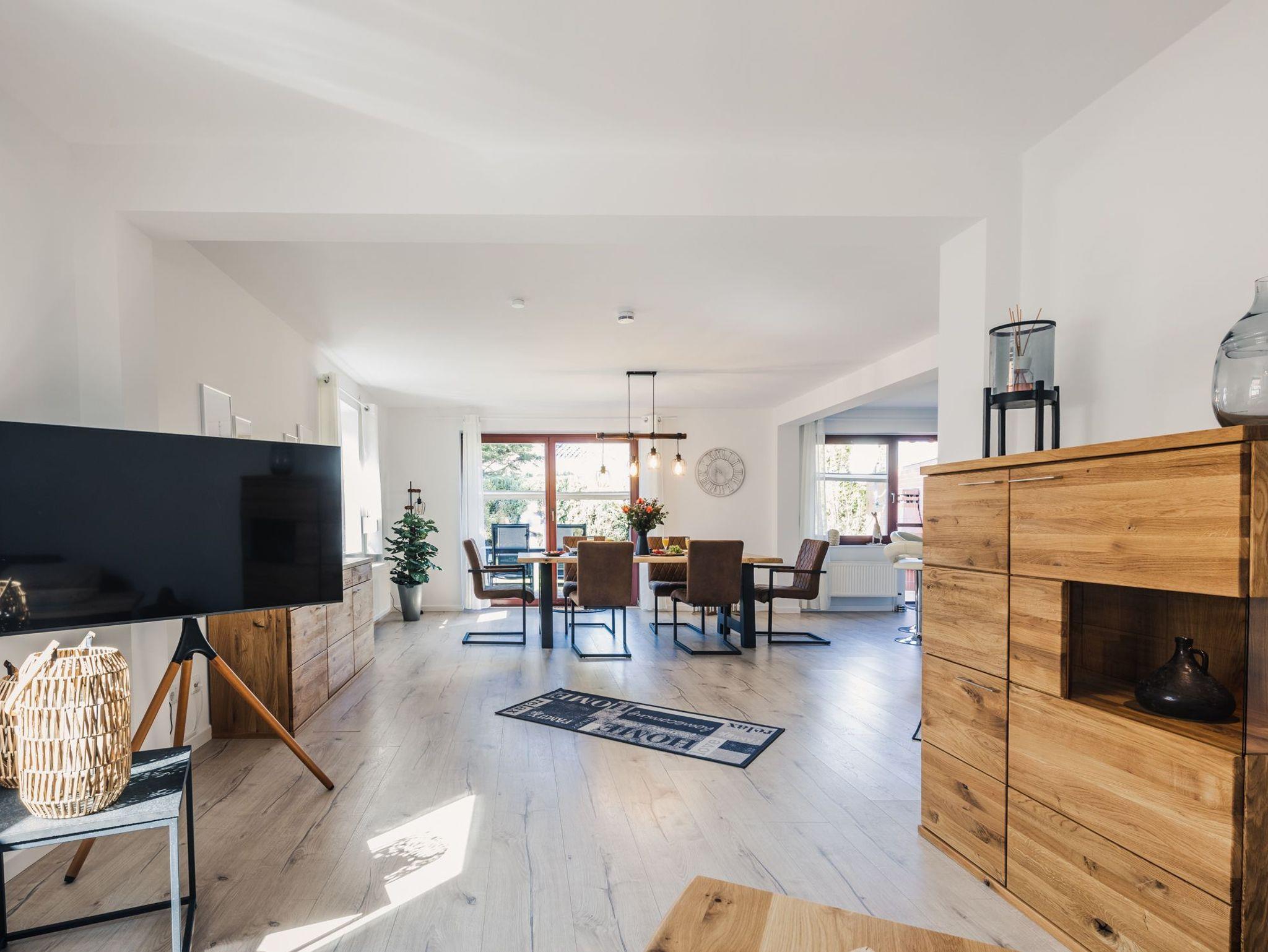 Das Erdgeschoss des Hauses besticht durch ein stillvolles Wohnflair, der weitläufige Wohn- und Essbereich mit bodentiefen Fenstern sowie einem Blick in den großzügigen Garten. Gleichzeitig animieren auf der angrenzenden West-Terrasse die Sonnenstrahlen zum Sonnenbaden und Entspannen.