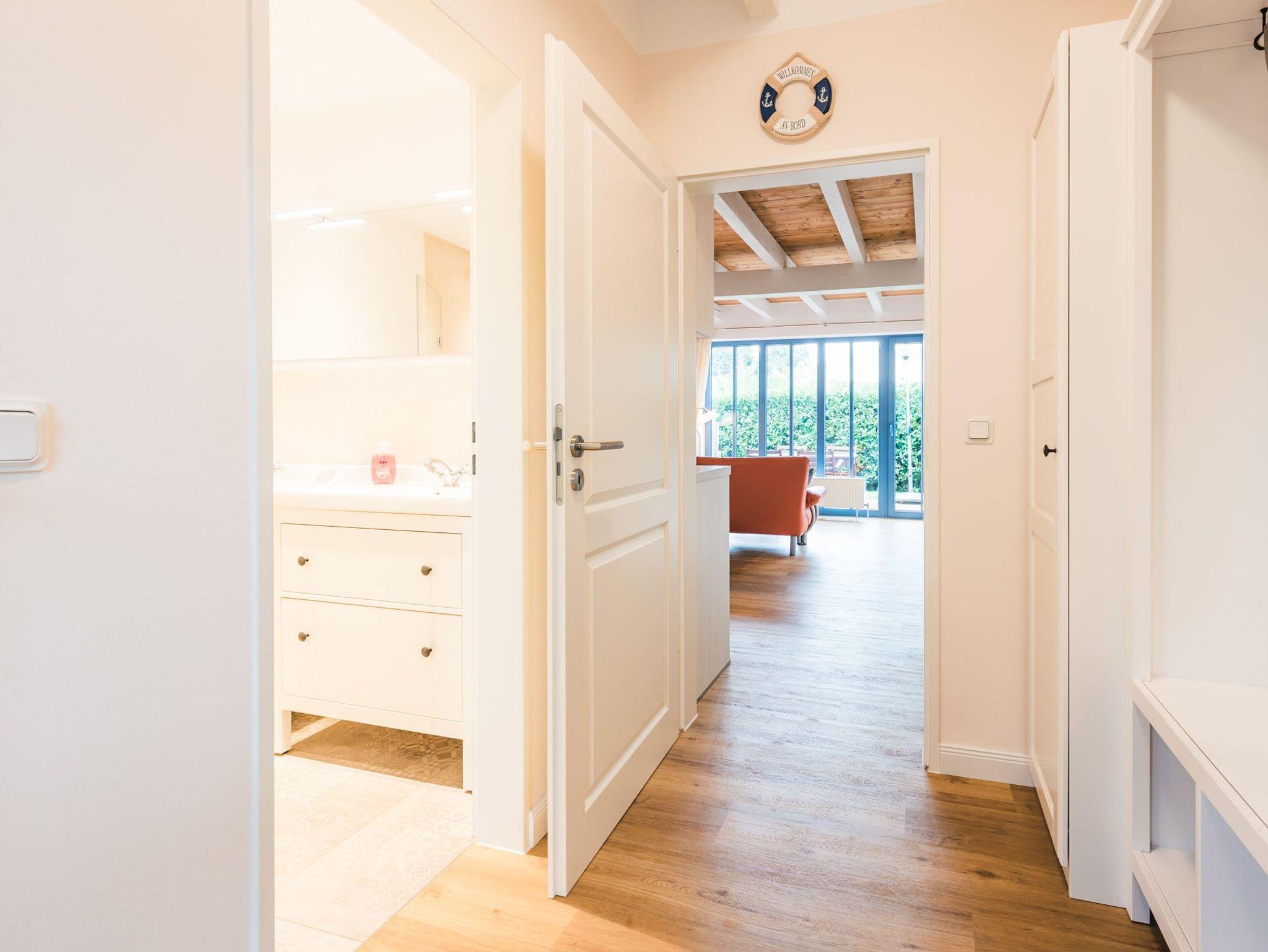 Das Badezimmer befindet sich ebenfalls im Erdgeschoss und ist mit einer Dusche ausgestattet. Das WC befindet sich separat direkt um die Ecke.