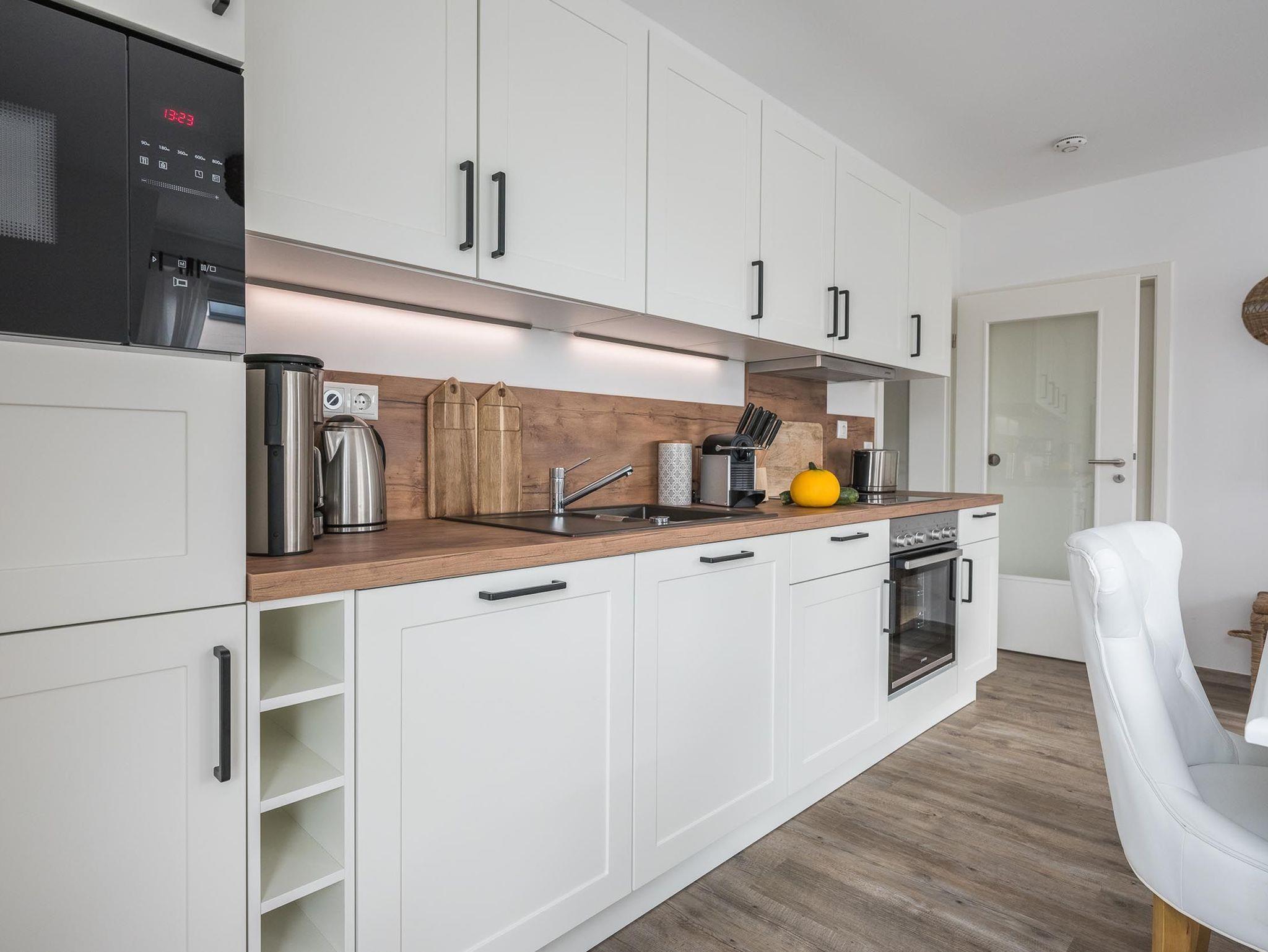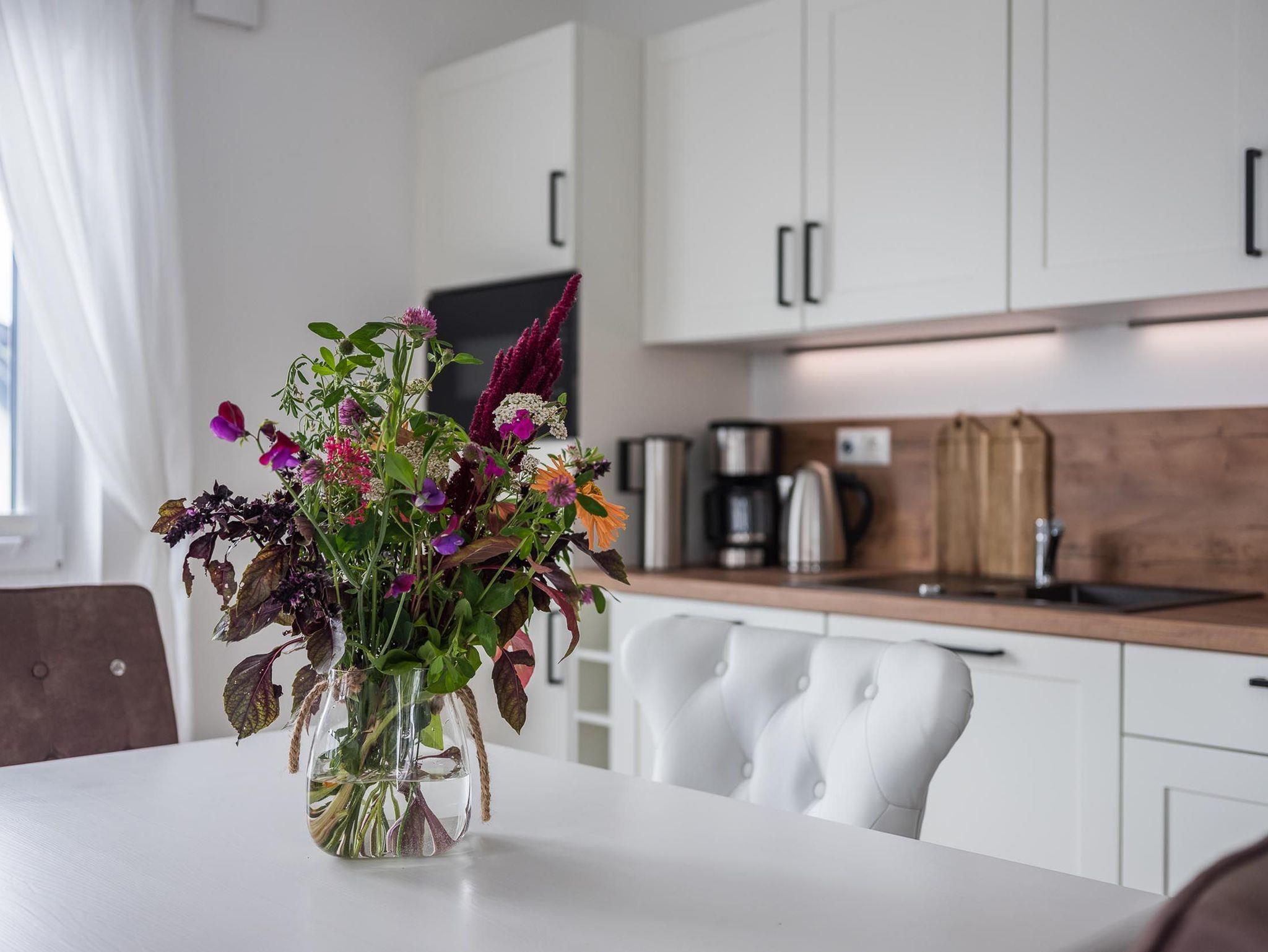 Sie verfügt über einen eleganten Wohnbereich mit einer offenen Küche und gemütlichem Essbereich. Die Küche ist hochwertig ausgestattet und lässt keine Wünsche offen.