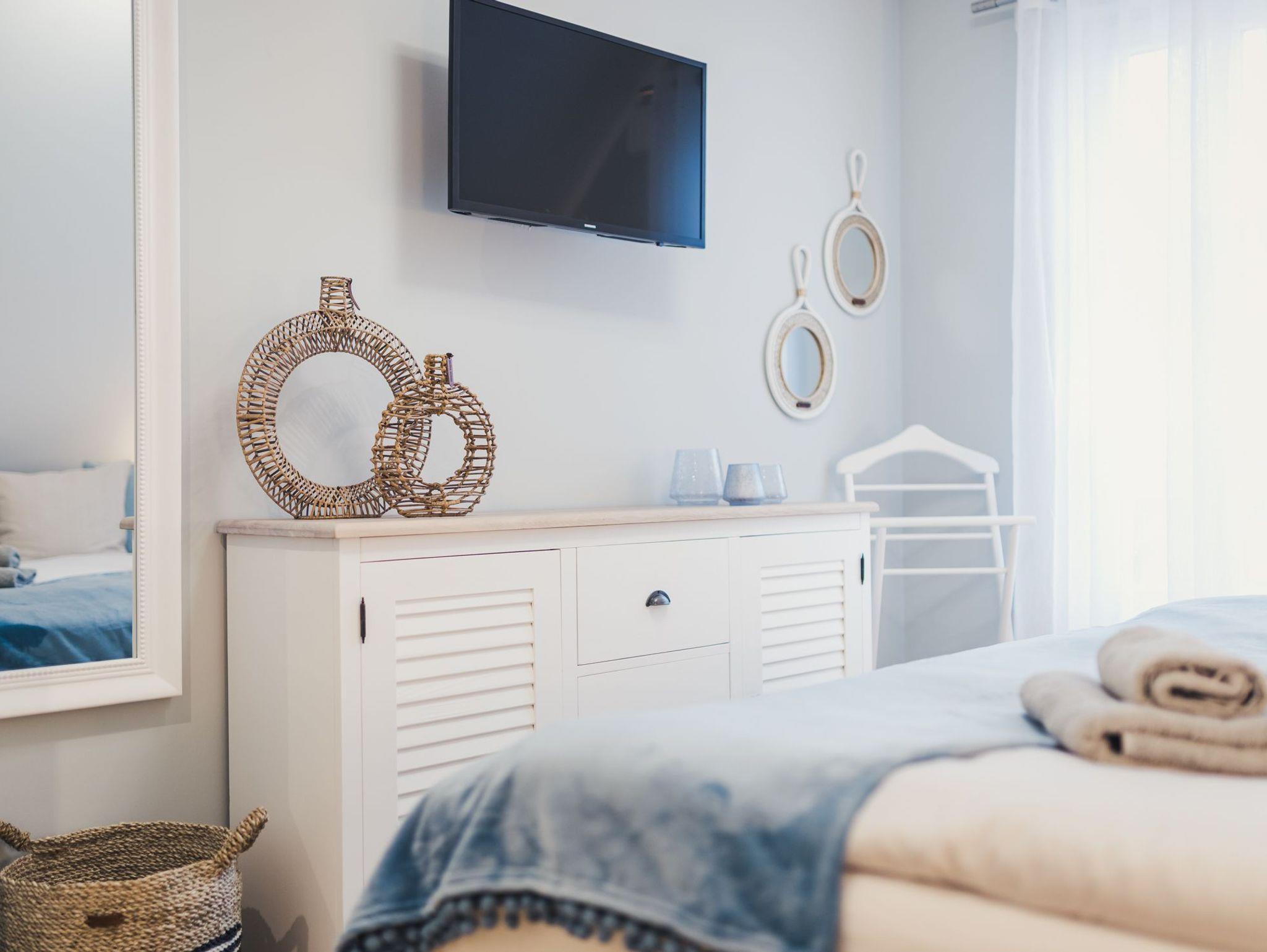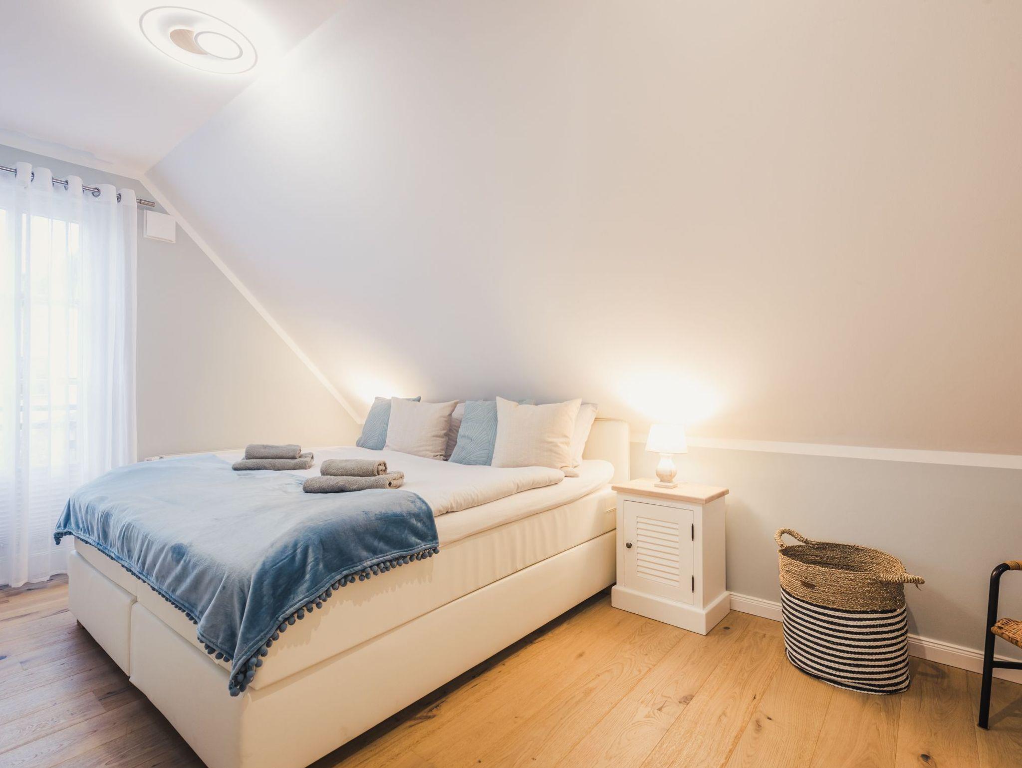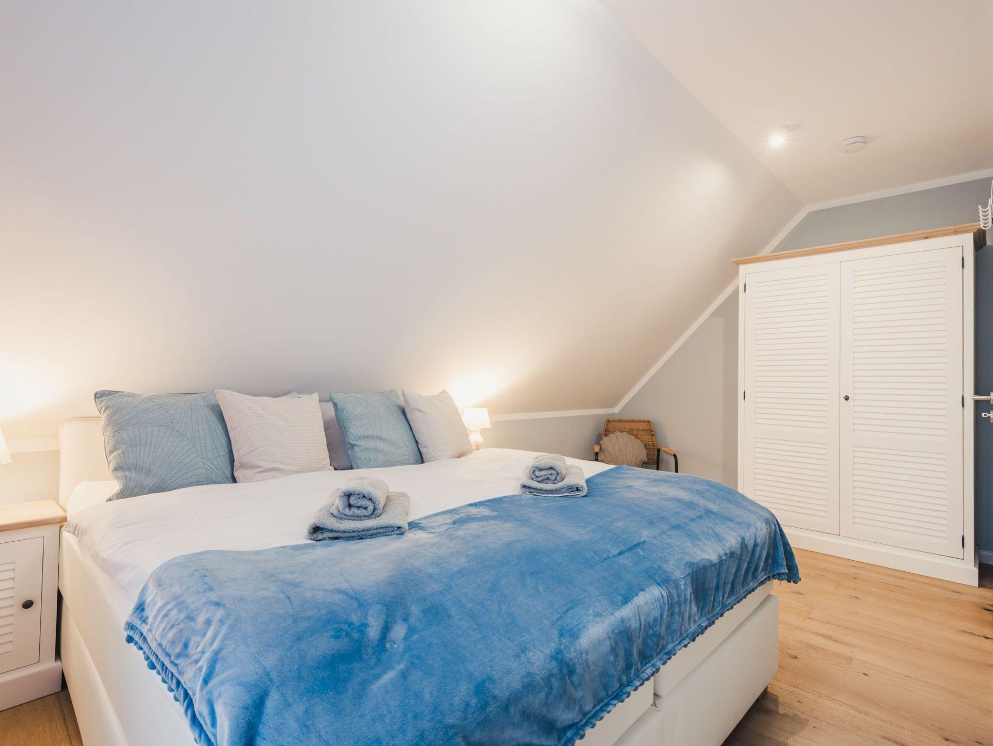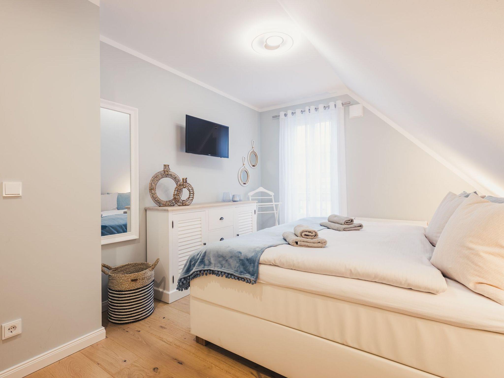 Über den Flur gelangen Sie in das modern gestaltete Schlafzimmer, ausgestattet mit hochwertigen Möbeln im Beach Style, einem komfortablem Boxspringbett und Flatscreen-TV. Hier werden Ihre Urlaubsträume wahr und Sie werden sich sicher wohlfühlen.