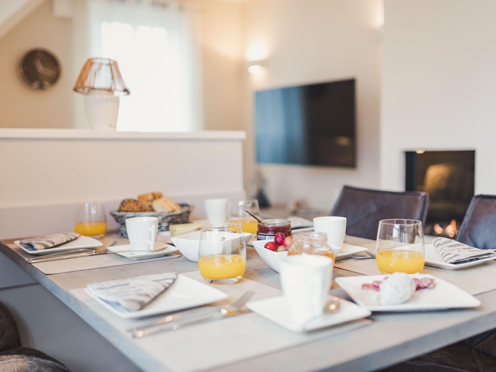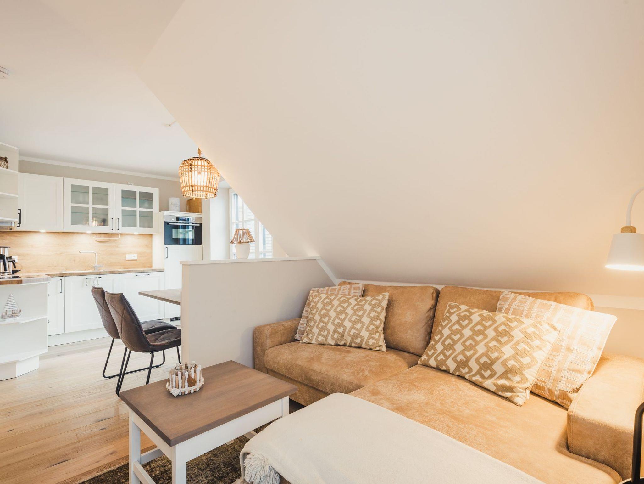 Die 56qm Wohnfläche verteilen sich auf zwei Etagen und bieten bis zu 4 Personen jeglichen Komfort für einen erholsamen Urlaub. Der großzügige, hochwertig eingerichtete Wohnbereich mit integrierter, moderner, voll ausgestatteter Küche und gemütlichem Essbereich lädt zum Wohlfühlen ein. Der lichtdurchflutete Wohnbereich verfügt zudem über einen Gaskamin und direktem Zugang zum sonnigen Balkon. Von hier aus können Sie spektakuläre Sonnenuntergänge mit einem Glas Wein genießen.