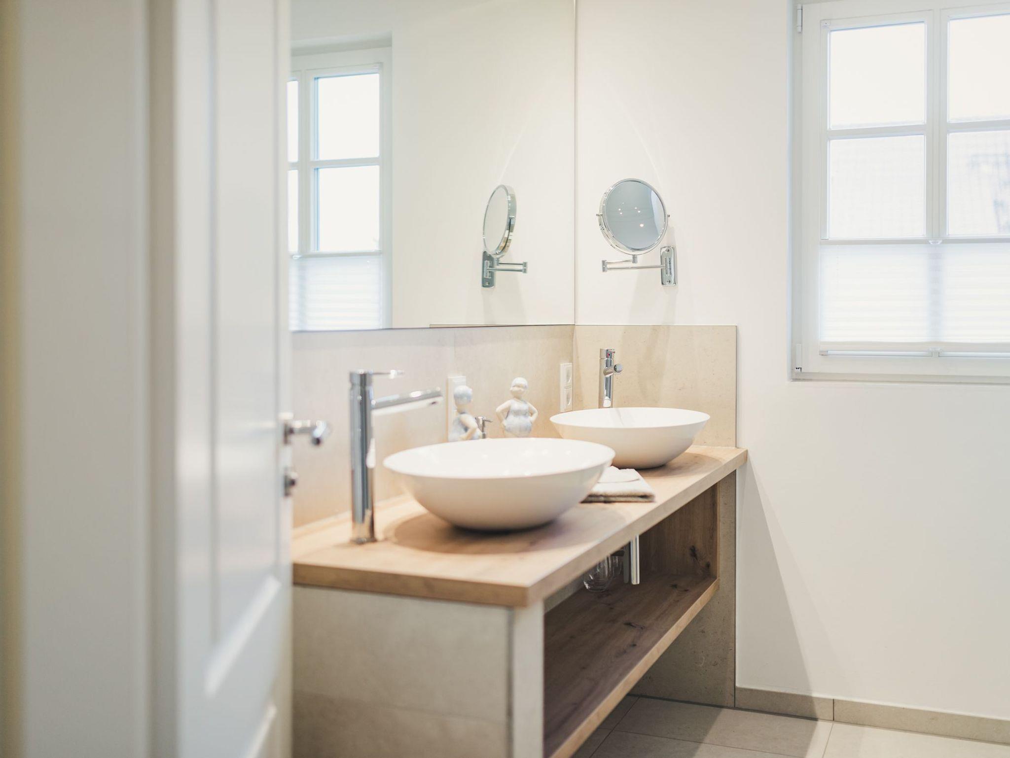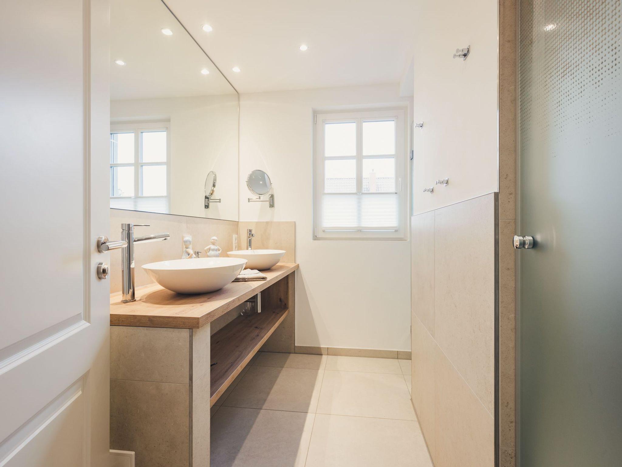 Das moderne Tageslichtbad bietet neben einer Dusche ein Doppelwaschbecken mit viel Ablagefläche. Die Toilette ist durch eine Glastür abgetrennt.