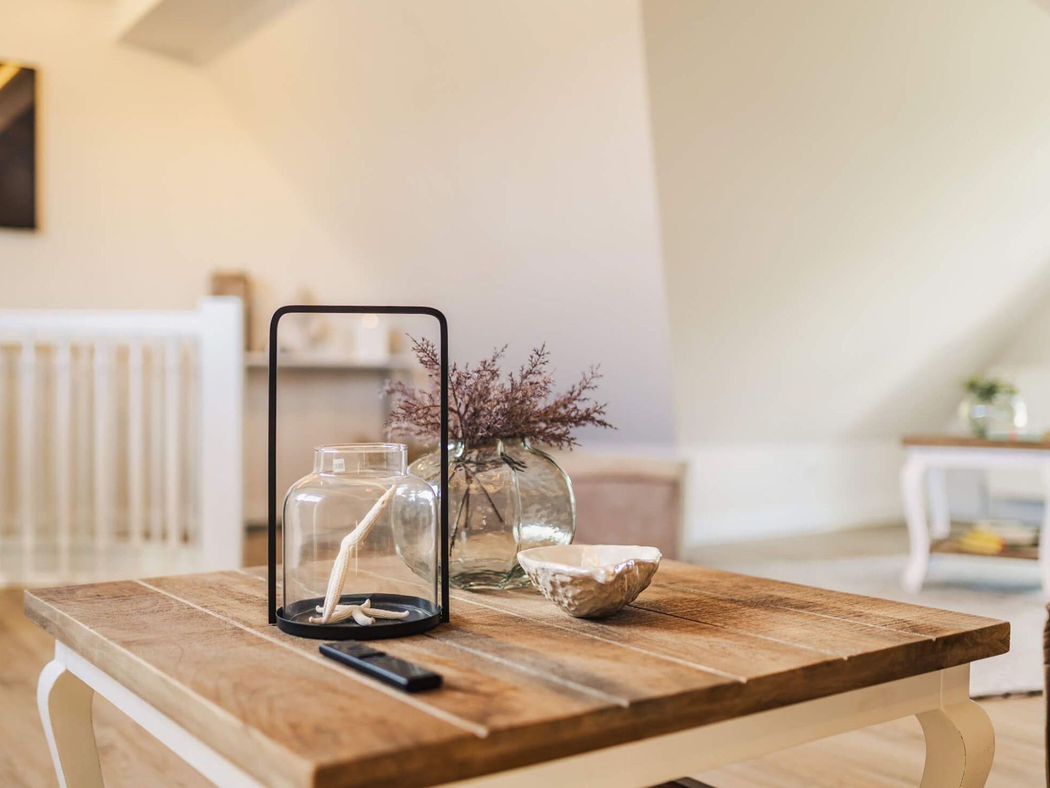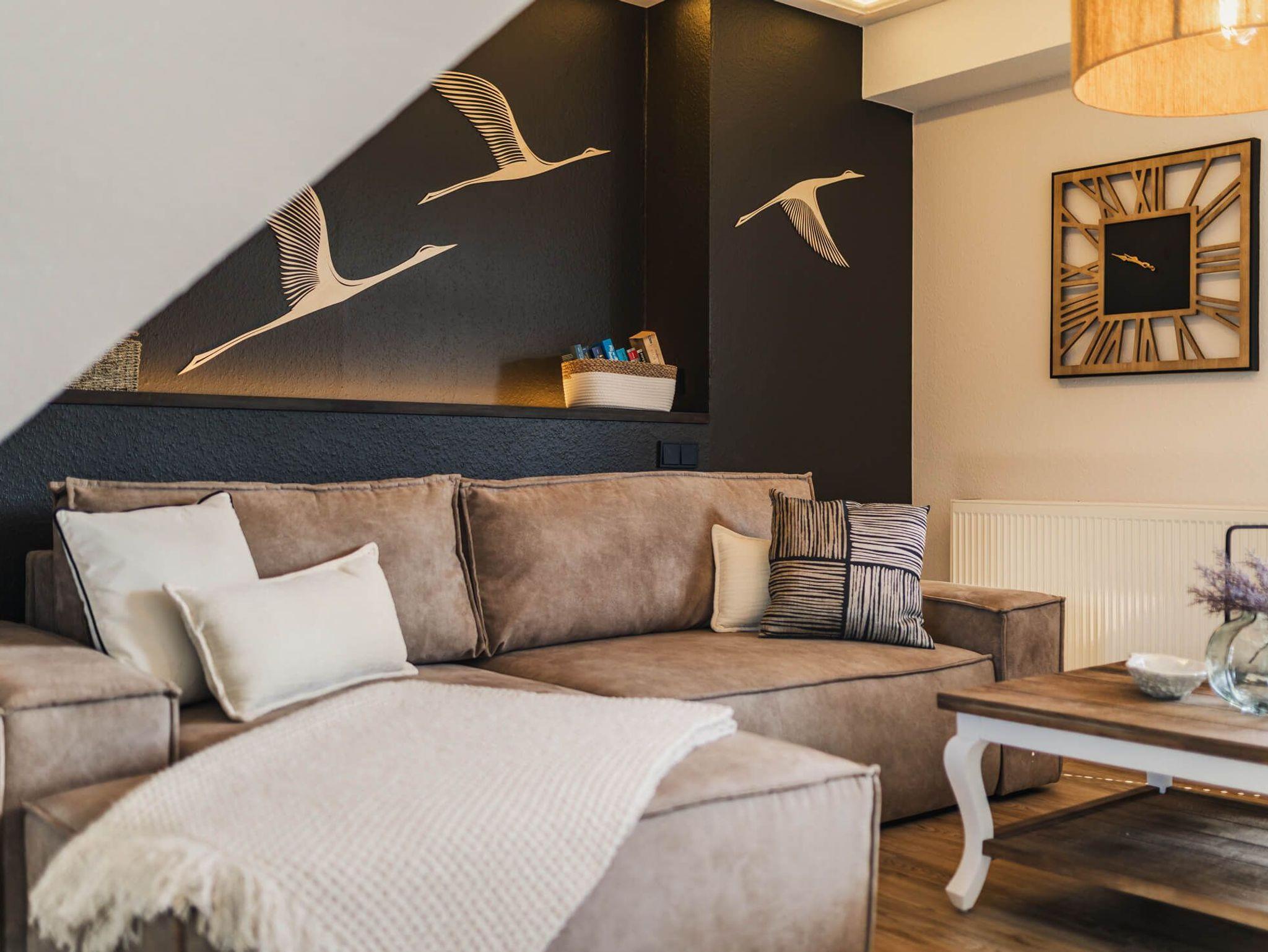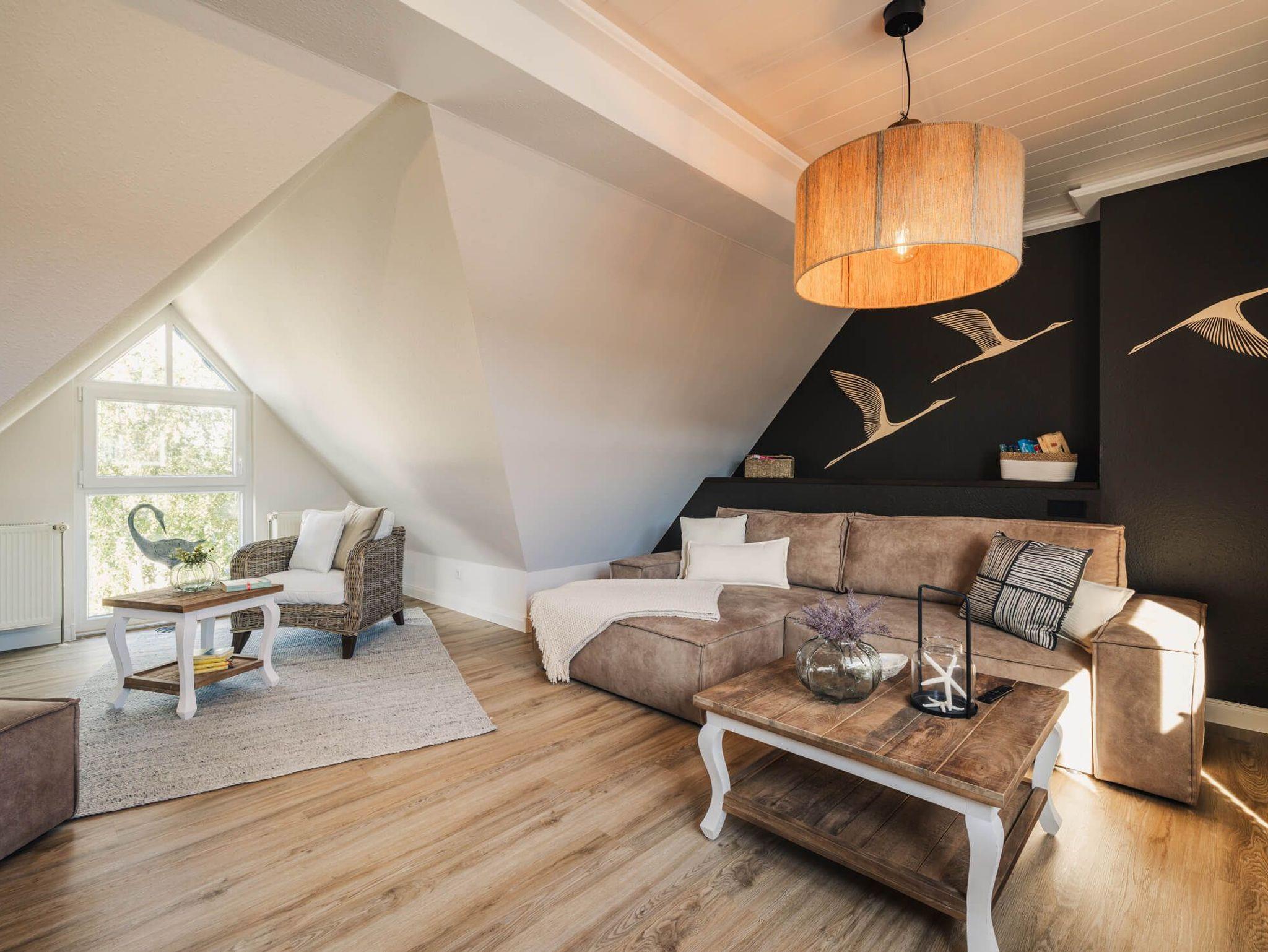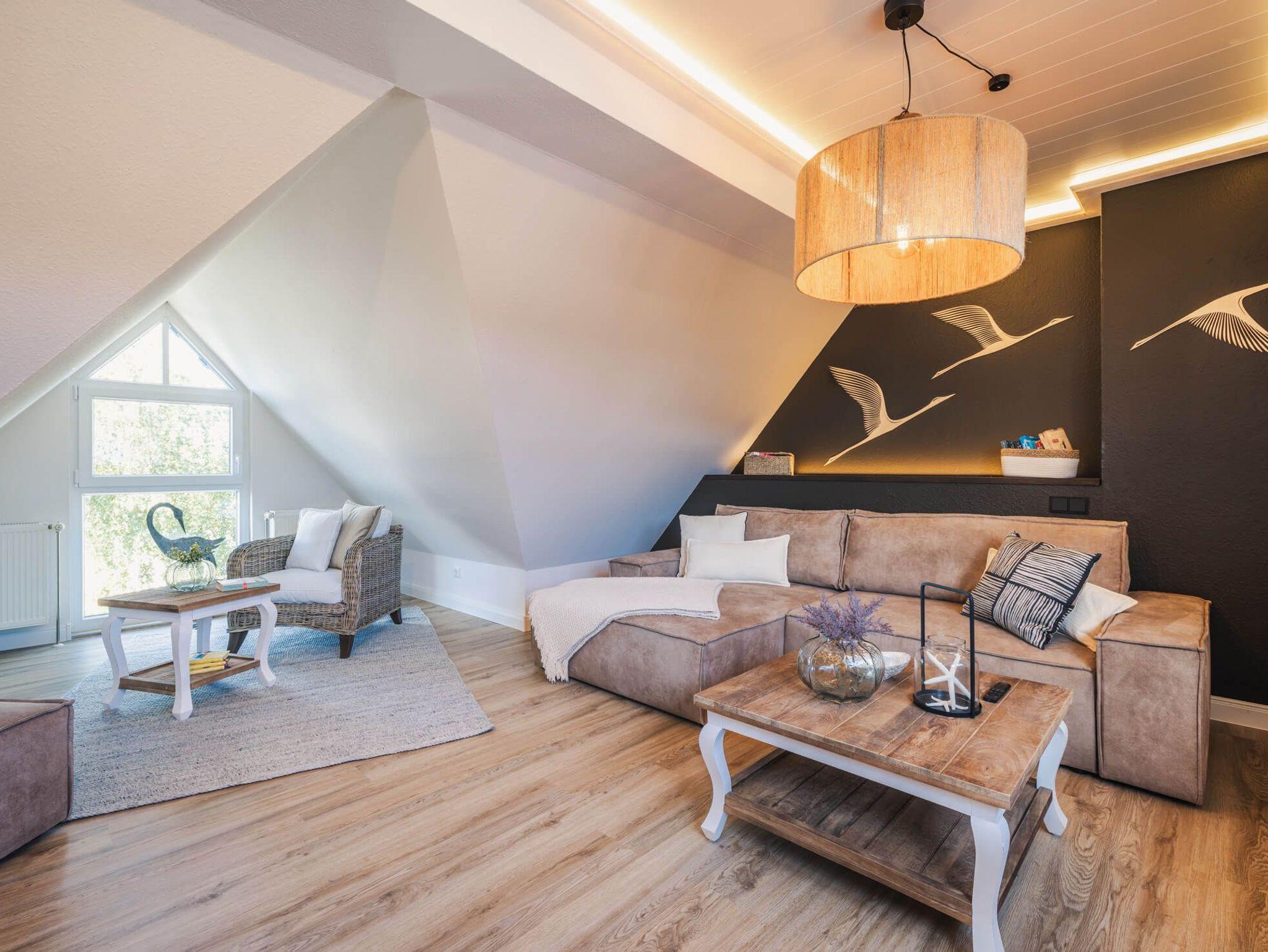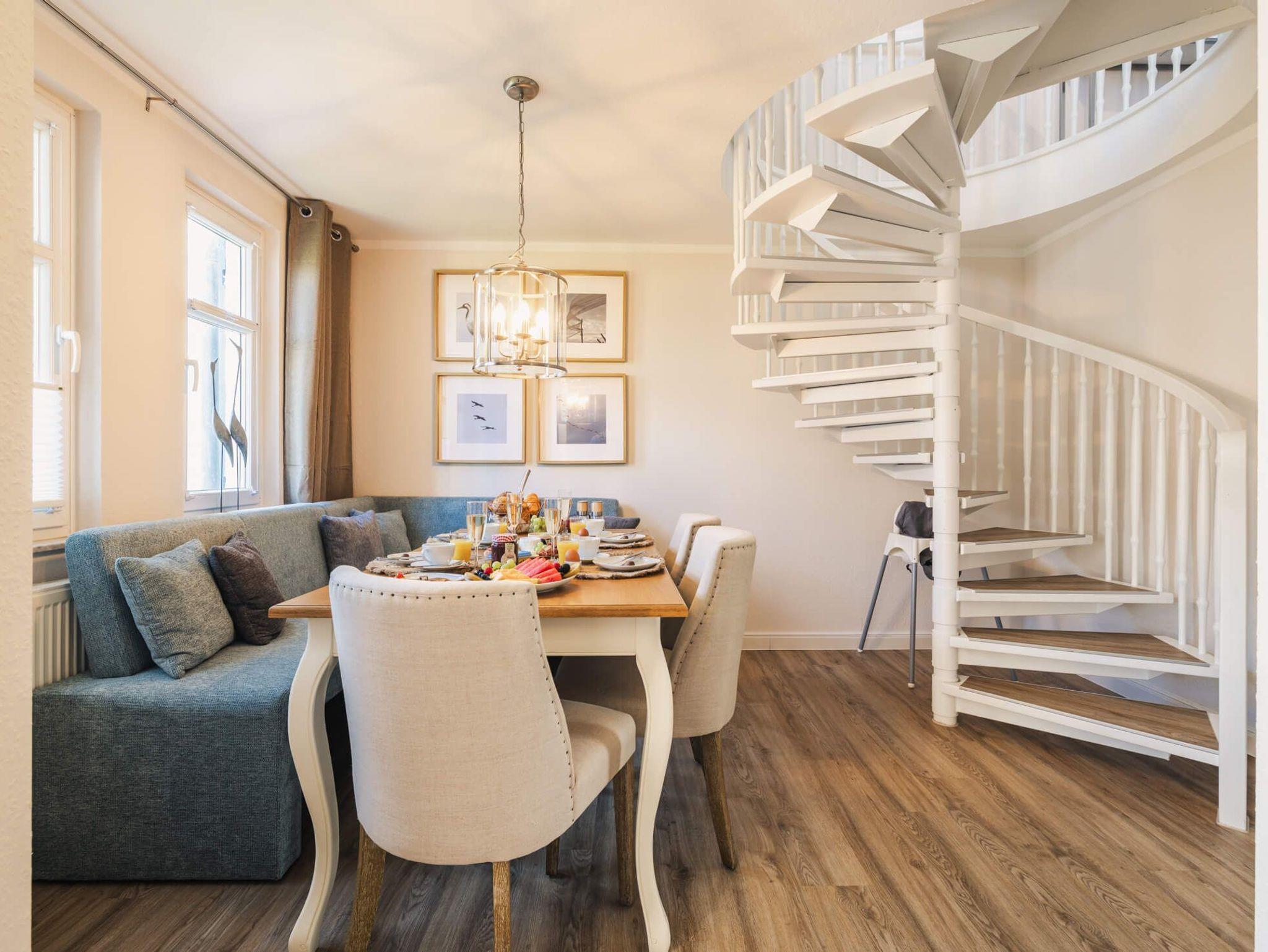 Über eine elegante Wendeltreppe gelangen Sie in den oberen Bereich der Wohnung, wo sich der helle und geräumige Wohnbereich befindet. Hier sorgt eine Aufbettung auf der bequemen Couch für zusätzliche Schlafplätze, die Flexibilität für größere Gruppen ermöglicht.