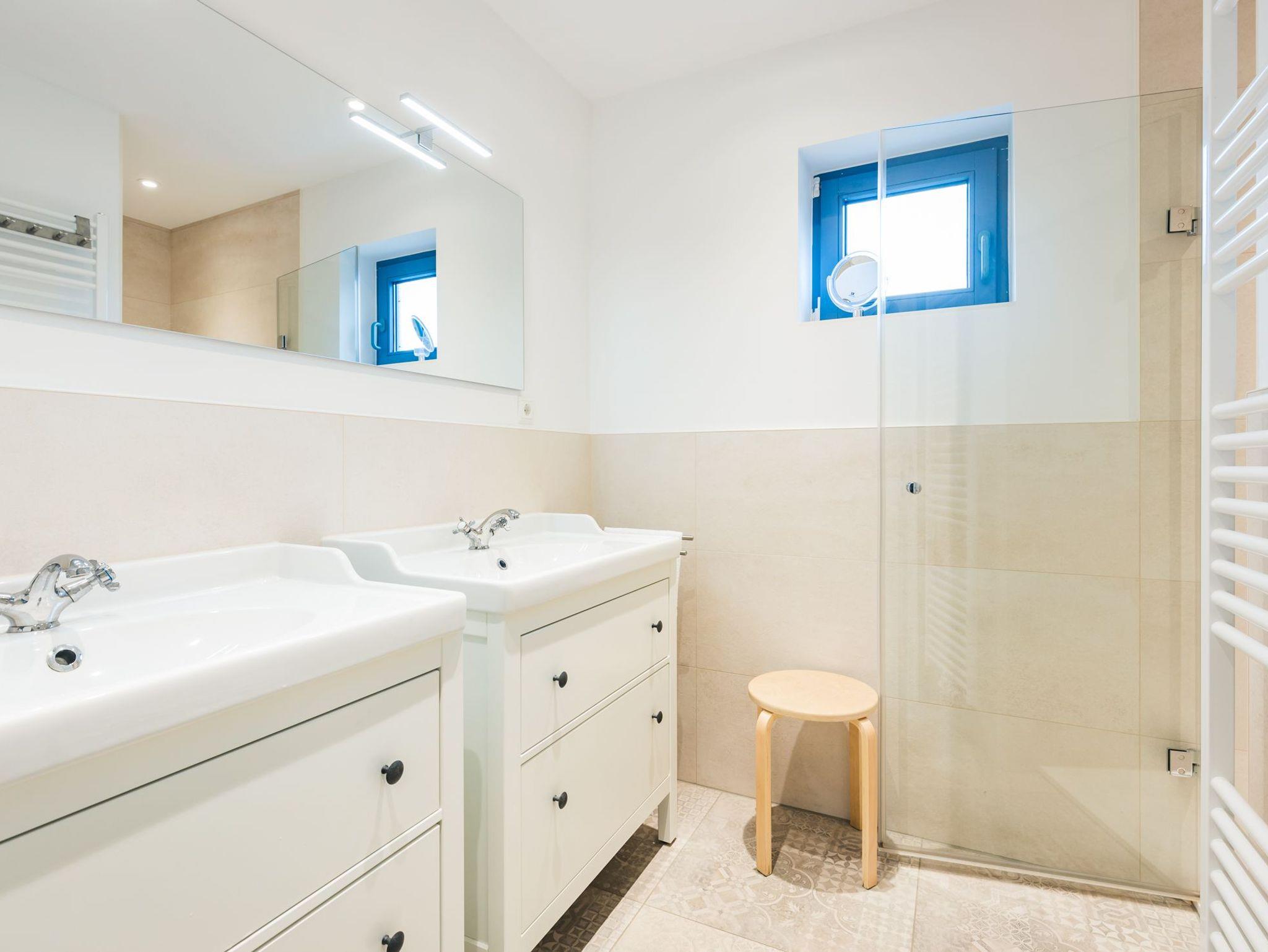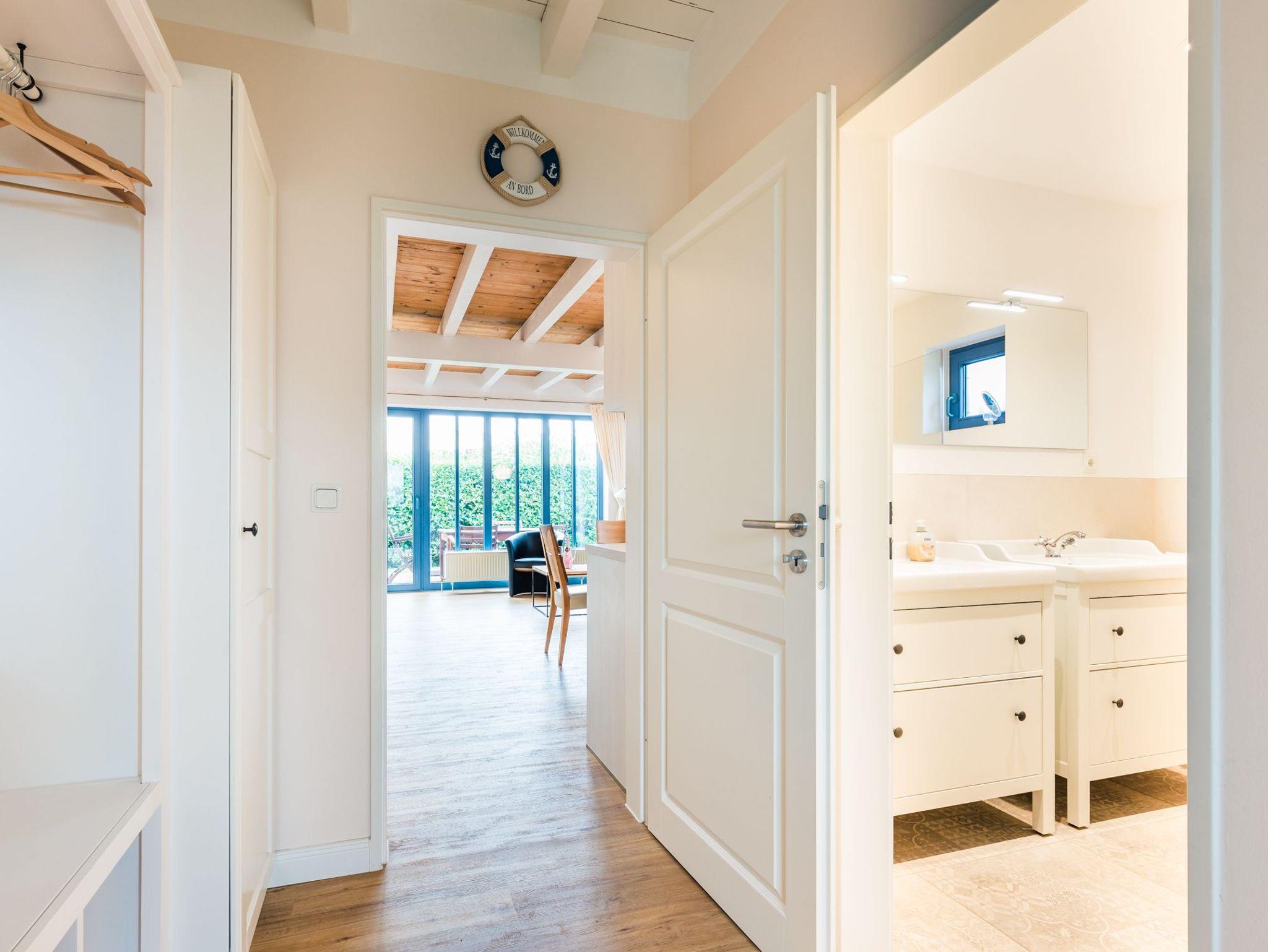 Das Badezimmer befindet sich ebenfalls im Erdgeschoss und ist mit einer Dusche ausgestattet. Das WC befindet sich separat direkt um die Ecke.