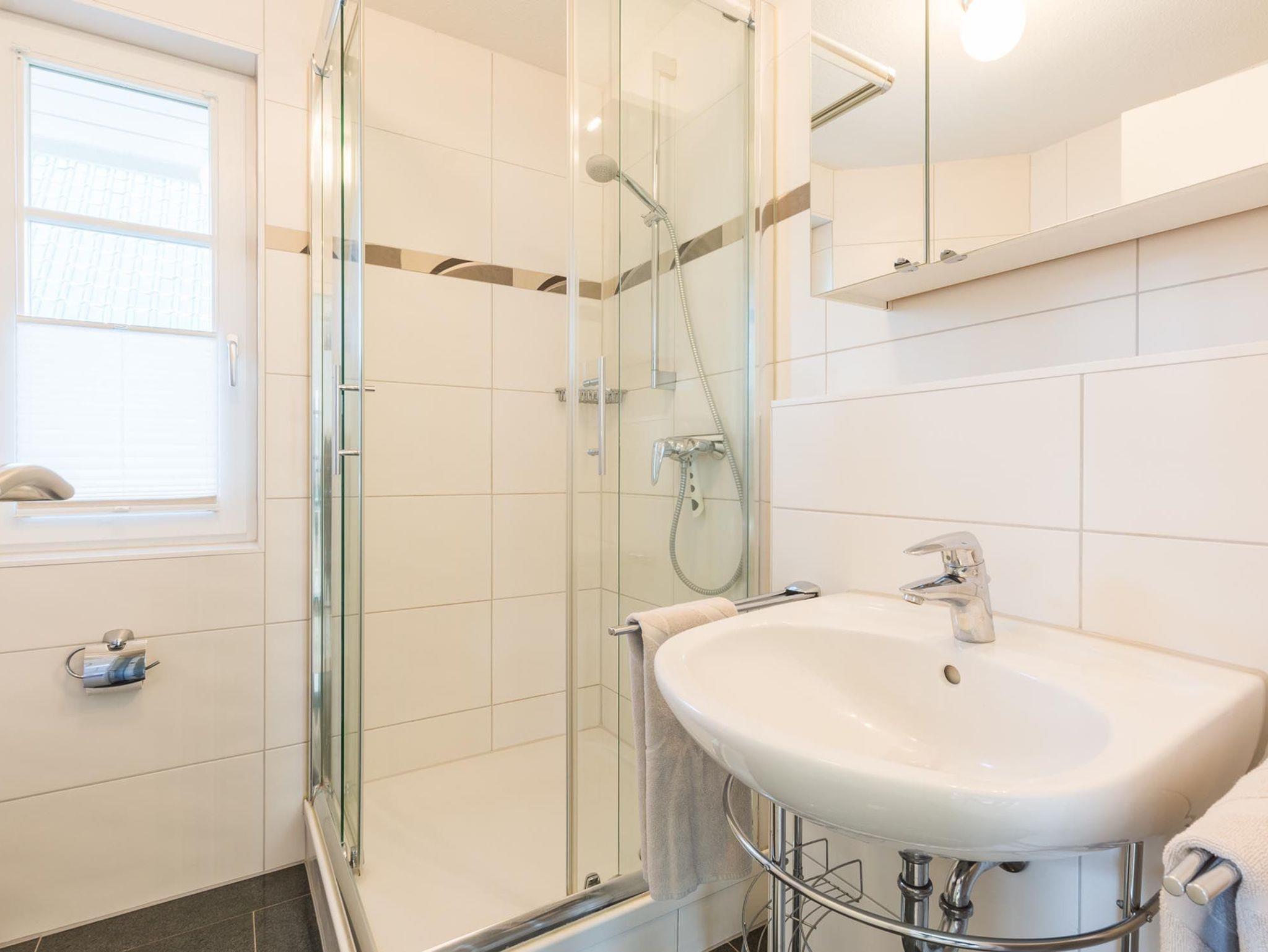 Das modern eingerichtete Badezimmer ist mit einer hochwertigen Dusche sowie einer Waschmaschine und einem Wäschetrockner ausgestattet.