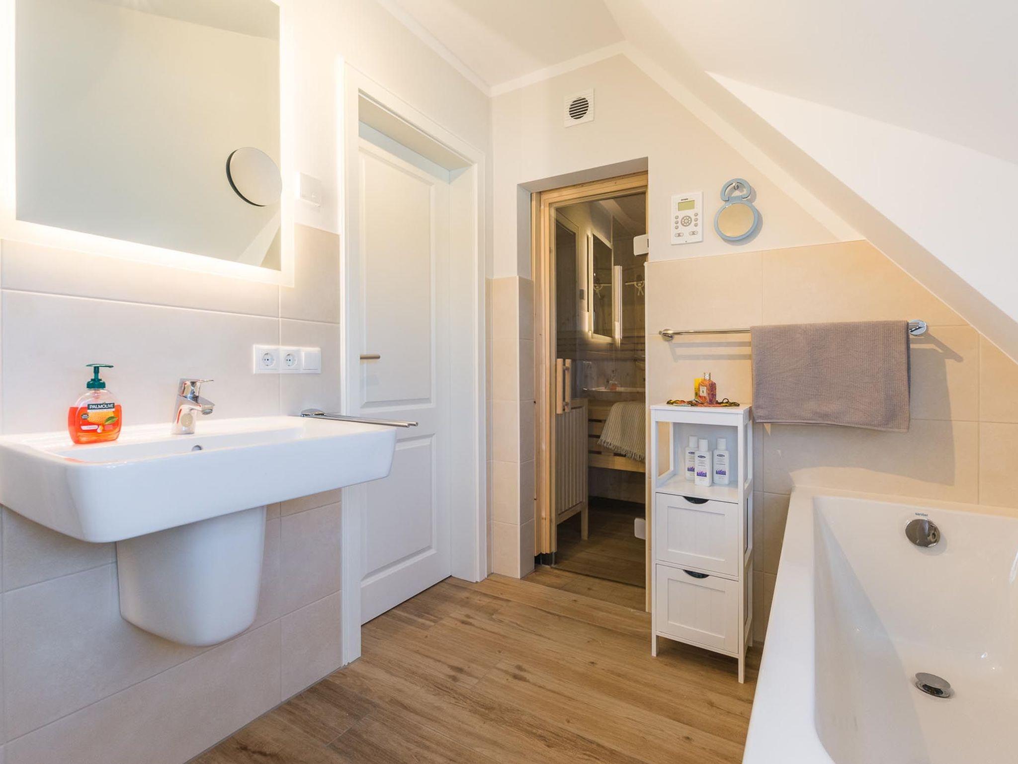 Im Obergeschoss befinden sich 3 Schlafzimmer sowie ein Badezimmer mit integrierter Sauna.