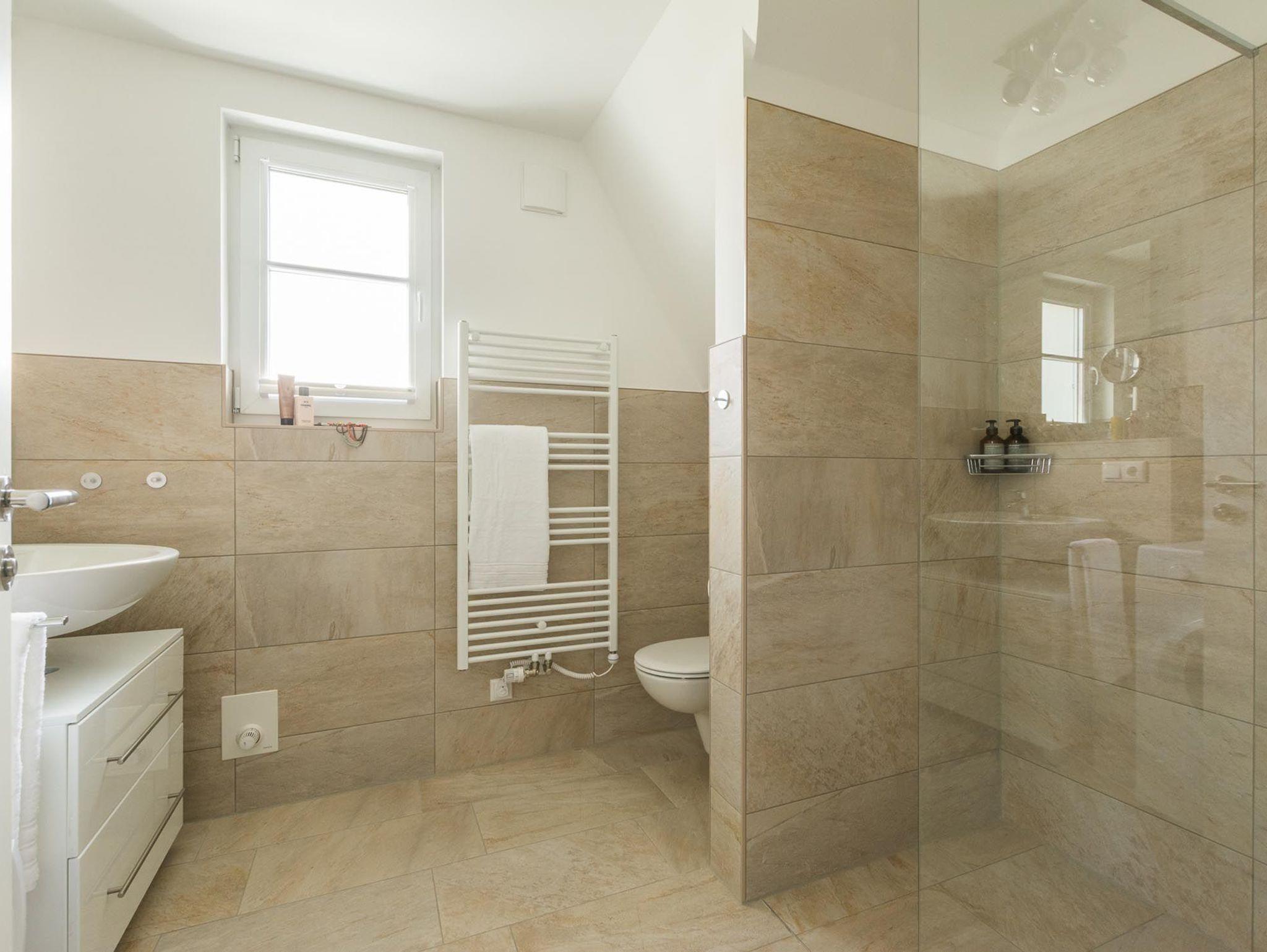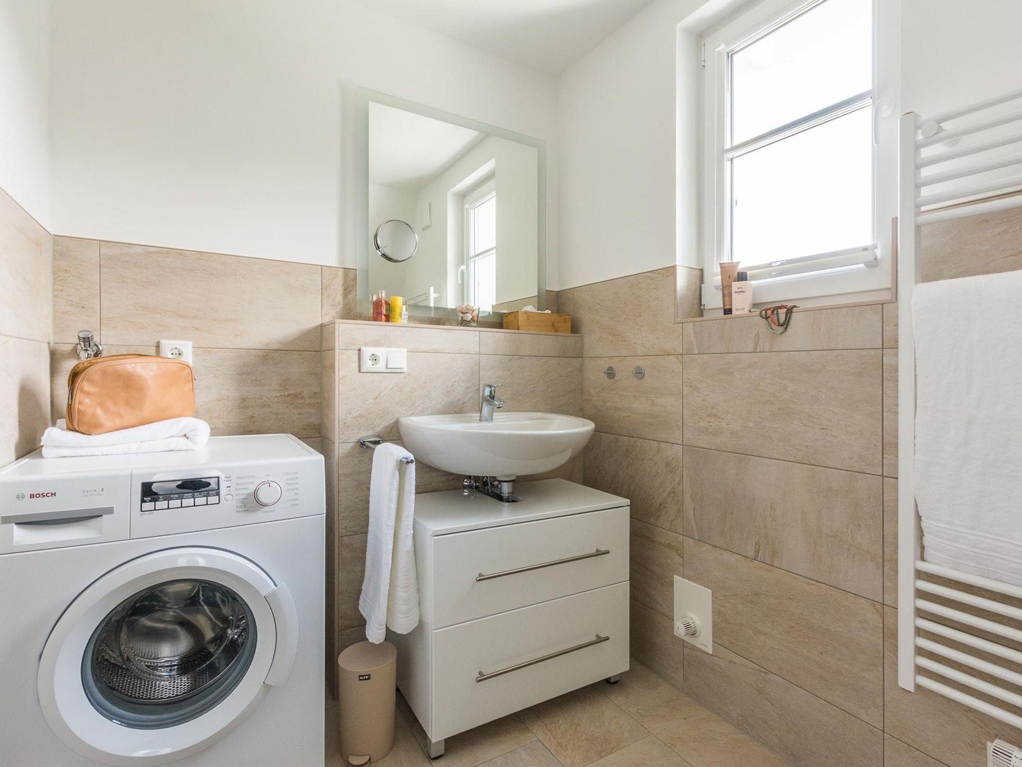 Das modern eingerichtete Badezimmer ist mit einer hochwertigen Dusche sowie einer Waschmaschine ausgestattet.