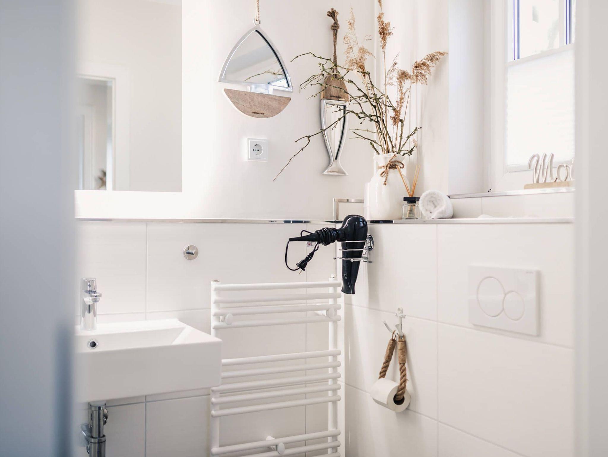 Im Obergeschoss finden Sie ein modernes ansprechendes Wannenbad vor. In beiden Schlafräumen laden komfortable Boxspringbetten zum erholsamen Schlaf ein. Sie finden neues Mobiliar sowie elegante und zugleich maritime Accessoires vor. Weitere zwei bequeme Schlafplätze bietet die hochwertige Schlafcouch im Wohnbereich.