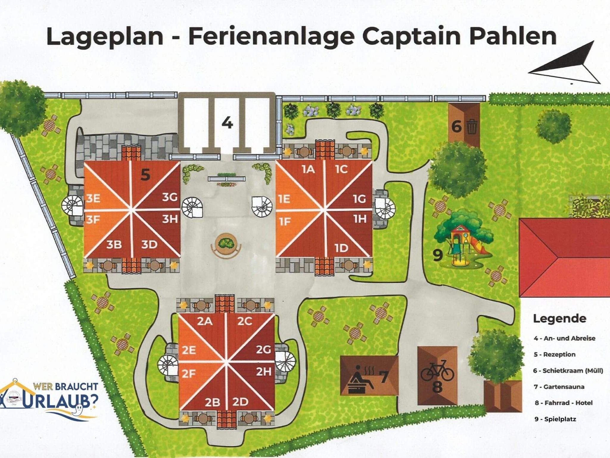 Die Ferienanlage Captain Pahlen in der Barther Straße ist ein markantes Ensemble im Herzen von Zingst. Die Anlage kombiniert historische Kapitänshaus-Ästhetik mit modernem Wohnkomfort und bietet Gästen Annehmlichkeiten wie einen gemeinschaftlichen Innenhof, sichere Fahrradständer und eine exklusive Gartensauna (Nutzung gegen Gebühr). Für jede Wohneinheit steht ein reservierter Pkw-Stellplatz zur Verfügung, der sich in bequemer Gehweite (ca. 150 m) vom Objekt befindet.