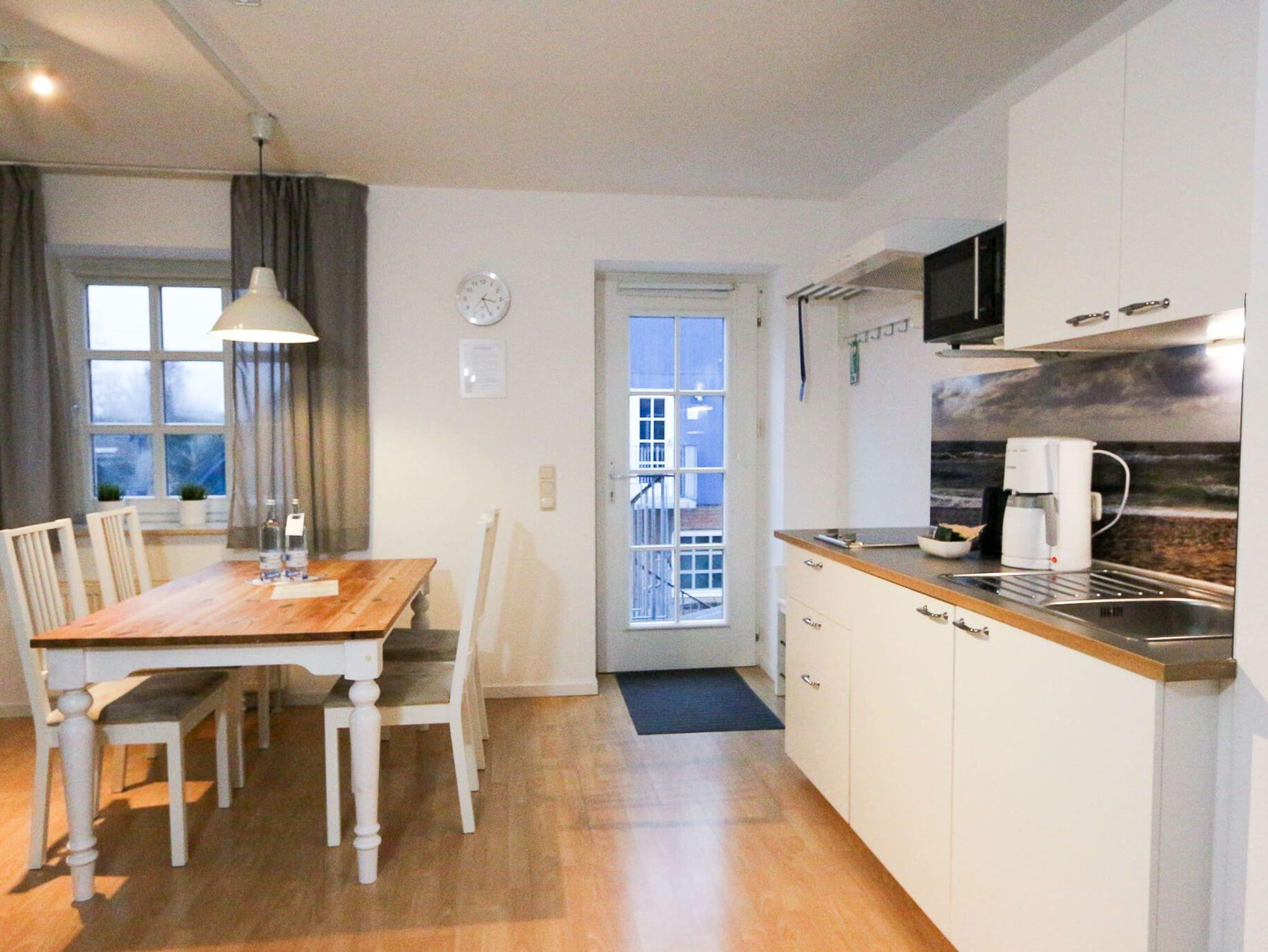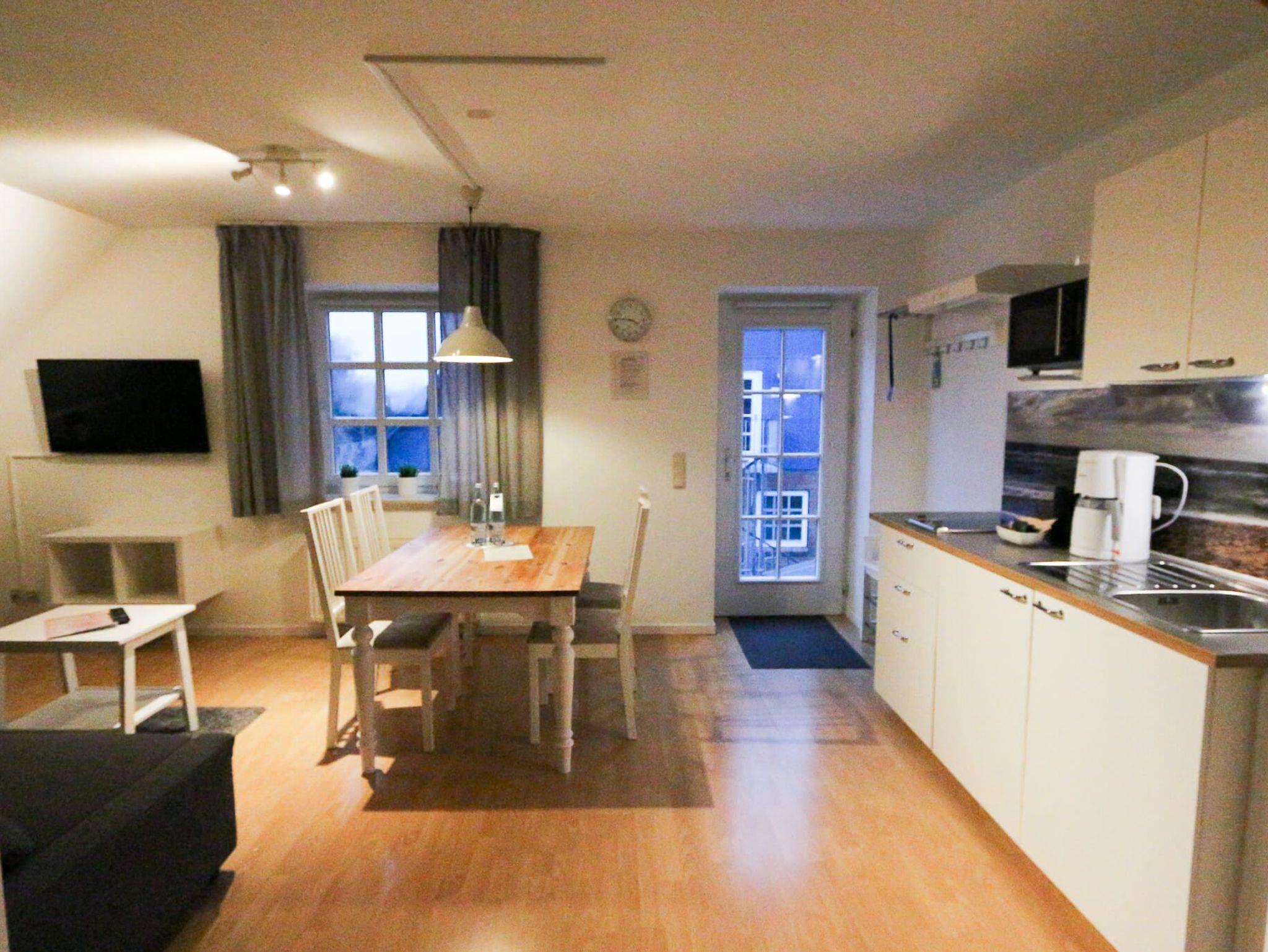 Das Maisonette-Apartment Ankerpunkt (3G) erstreckt sich über ca. 45 m² im Ober- und Dachgeschoss von Haus 3. Die Wohneinheit bietet Platz für bis zu 5 Personen und besticht durch ein helles, nordisches Design. Da in diesem Apartment keine Haustiere gestattet sind, genießen Gäste hier eine besonders gepflegte und tierfreie Atmosphäre. Die untere Ebene beherbergt den Wohn-Essbereich mit voll ausgestatteter Küchenzeile (Ceranfeld, Mikrowelle mit Grillfunktion) und Smart-TV. Im Dachgeschoss befinden sich das Hauptschlafzimmer sowie eine zusätzliche, gemütliche Schlafkoje. Das moderne Tageslichtbad verfügt über eine Dusche und stellt kostenfreie Pflegeprodukte bereit. WLAN sowie ein komplettes Wäschepaket sind inkludiert.