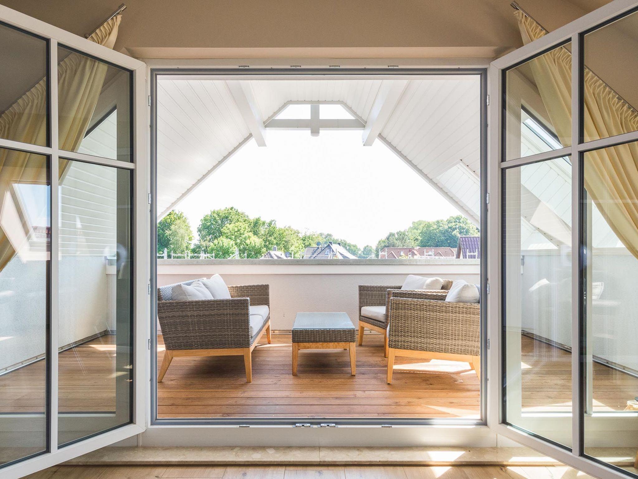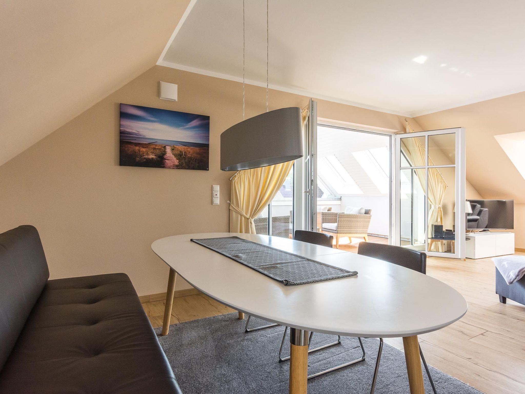 Vom Wohnzimmer aus hat man direkten Zugang zur großen möblierten Dachterrasse und kann hier wunderschöne Sonnenuntergänge genießen.