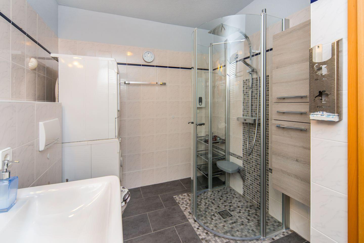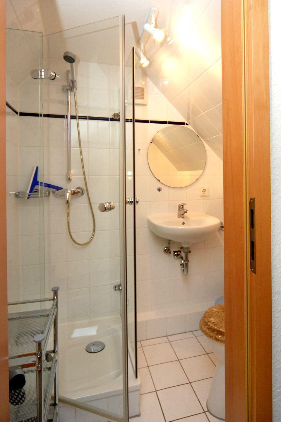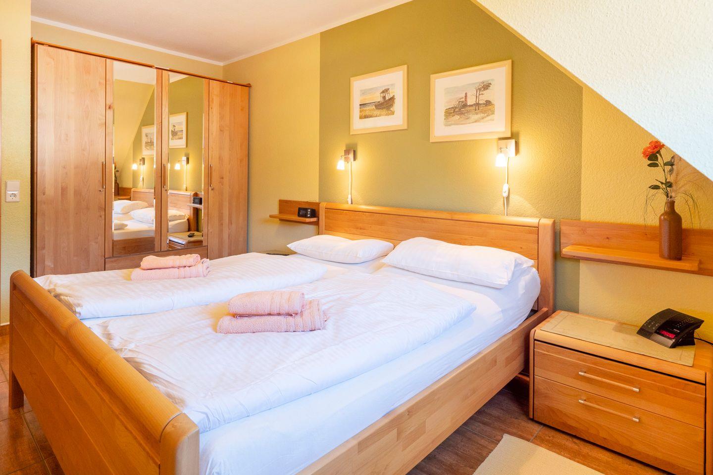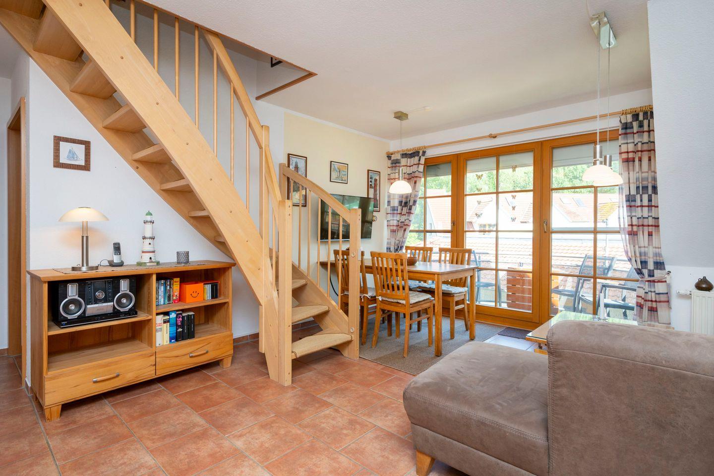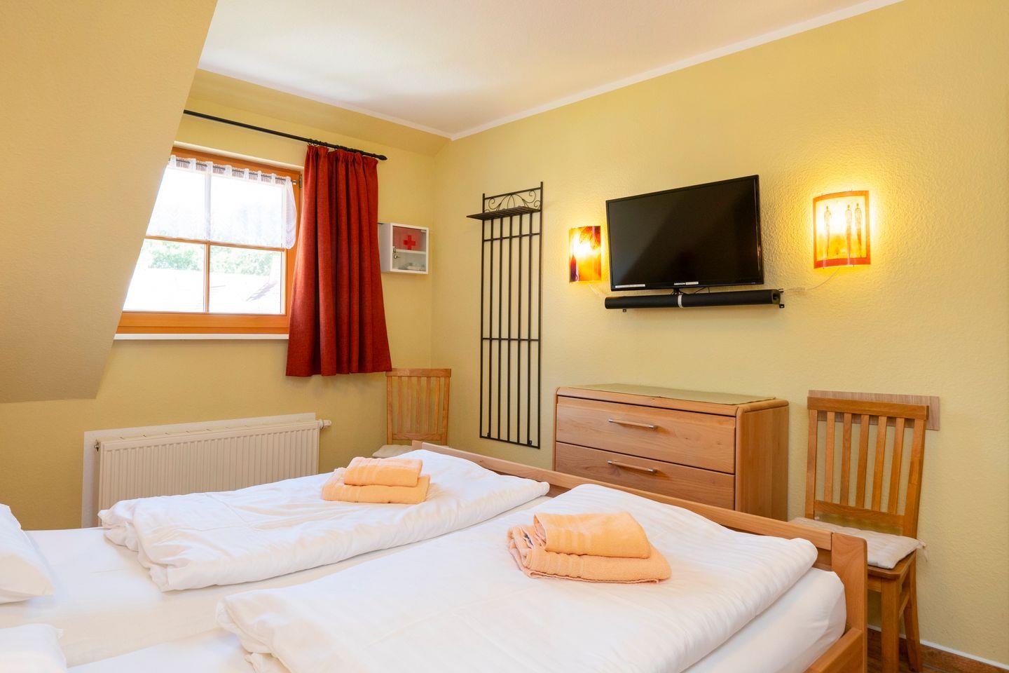 Im ausgebauten Dachgeschoss finden Sie einen weiteren Wohnbereich mit Schlafsofa und TV, ein Schlafzimmer mit zwei Einzelbetten sowie ein zweites Duschbad – perfekt für den Urlaub mit 5 Personen, bei dem auch die Privatsphäre nicht zu kurz kommt.