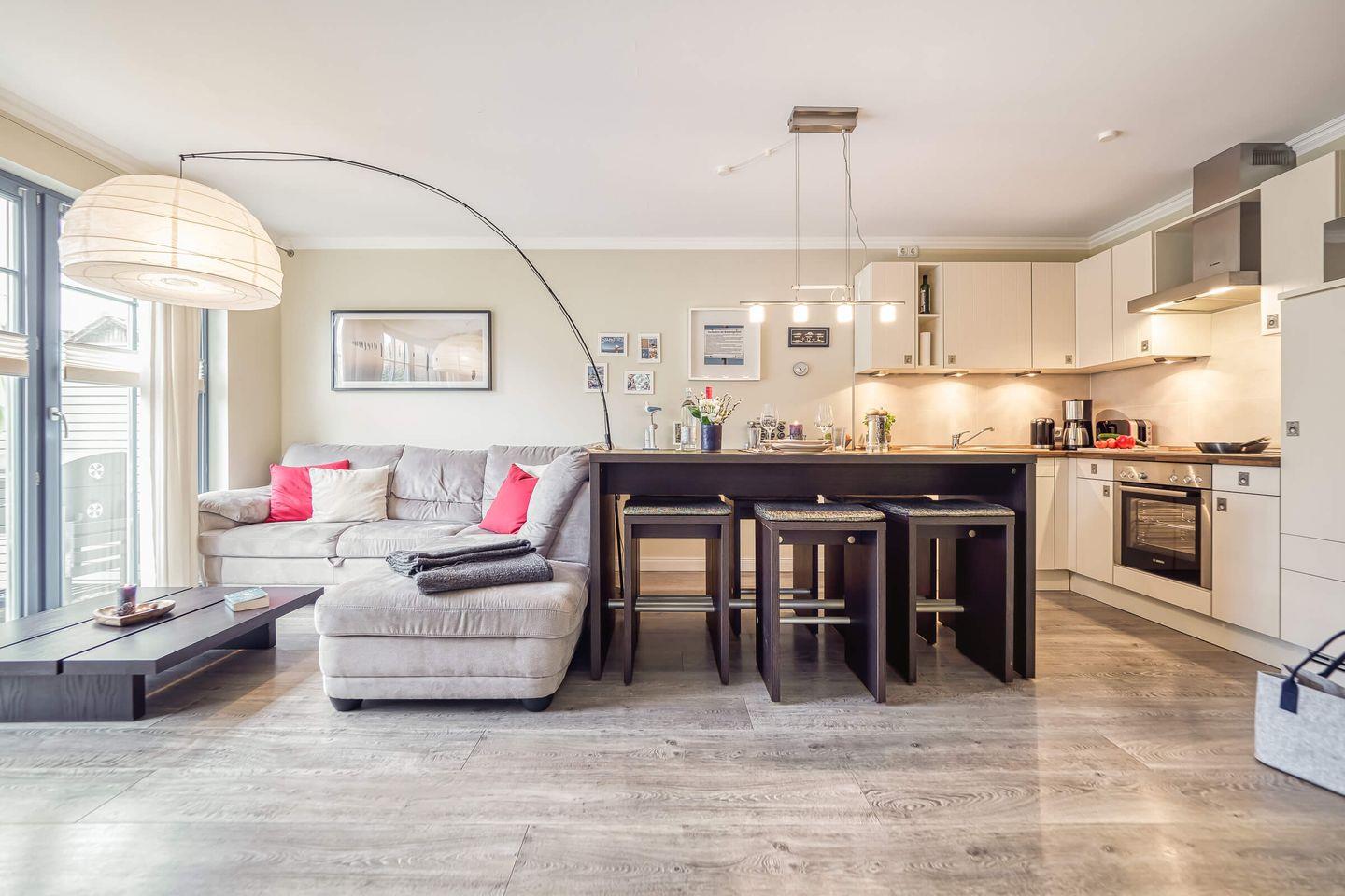 Die hochwertige Ausstattung lässt kaum einen Wunsch offen. Die Wohnung verfügt über Fußbodenheizung und Laminat in Holz-Optik.