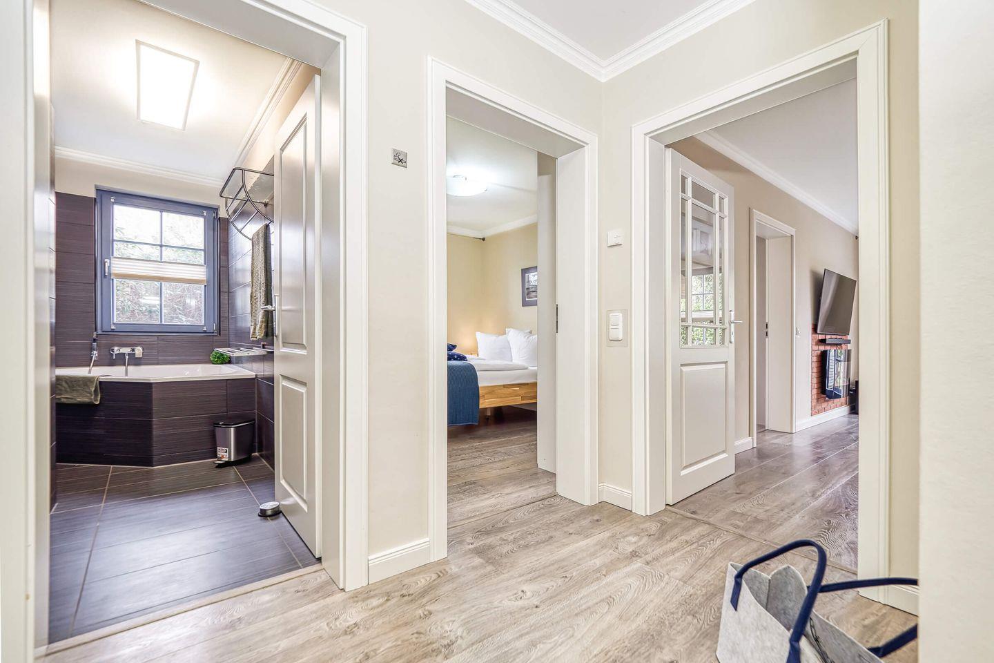 Das Bad ist mit einer Eckbadewanne und bodentiefer Vollglas-Duschkabine ausgestattet.