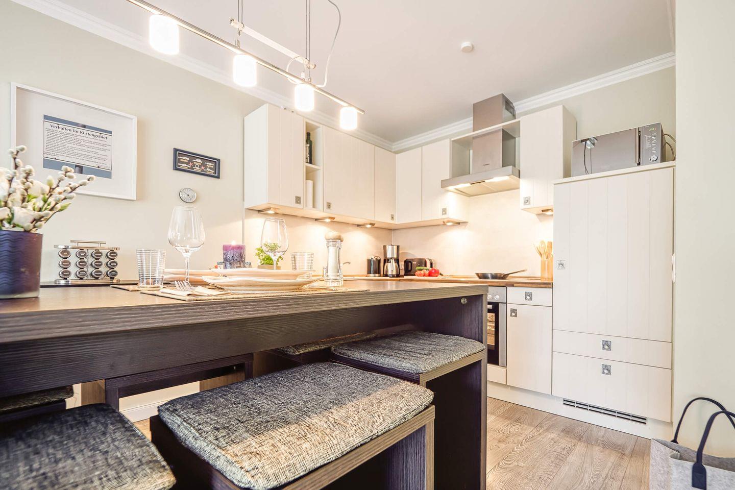 Bosch-Küche mit Herd/Backofen und Mikrowelle, Kühlschrank mit Gefrierfach und Geschirrspülmaschine mit Hoch-Esstisch für bis zu 6 Personen.