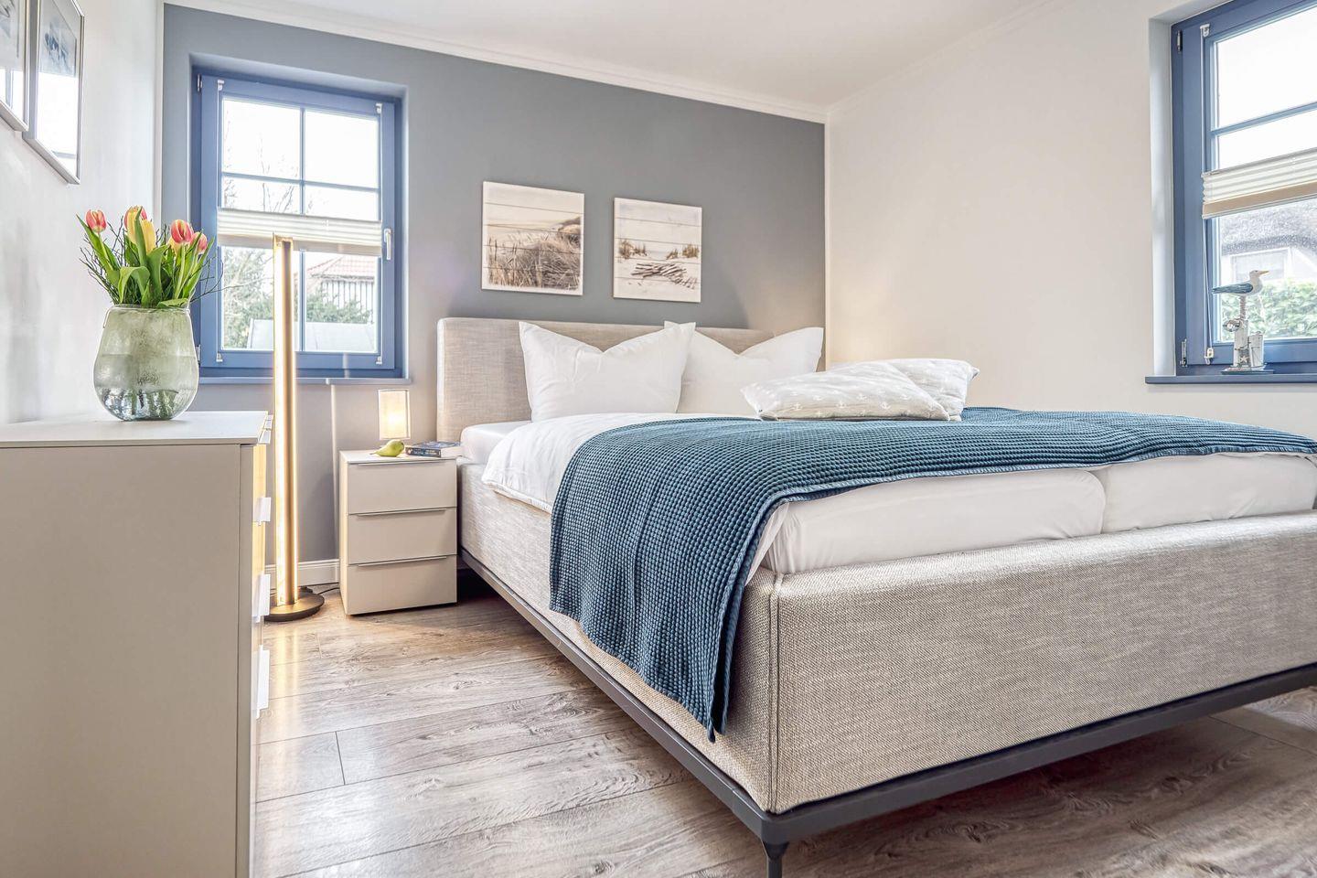 Zwei Schlafzimmer mit je einem Doppelbett (160x200 cm und 140x200 cm) für bis zu vier Übernachtungsgäste stehen bereit.