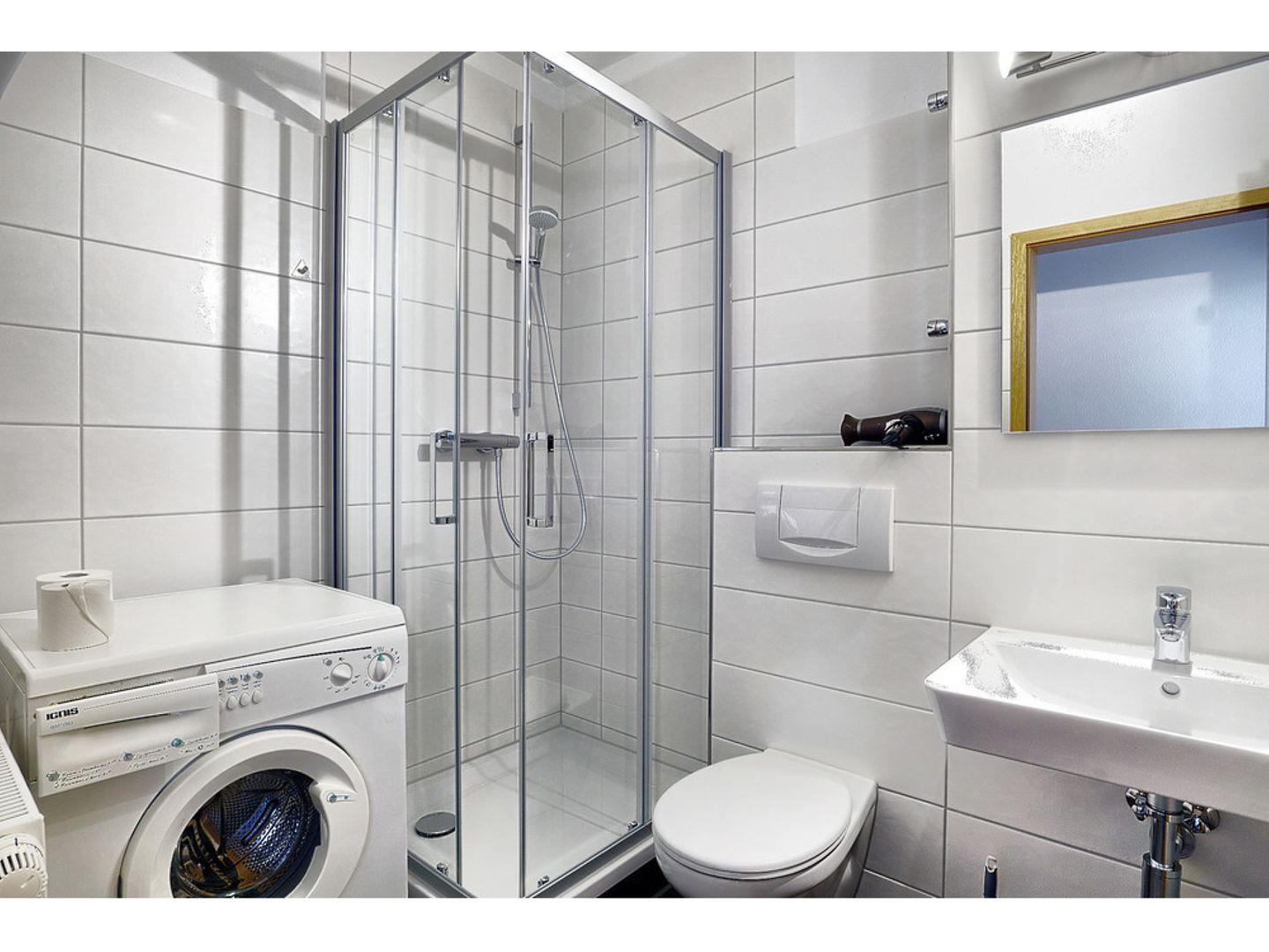 Das Badezimmer ist mit einer Glasdusche ausgestattet und auch eine Waschmaschine steht zur Verfügung.