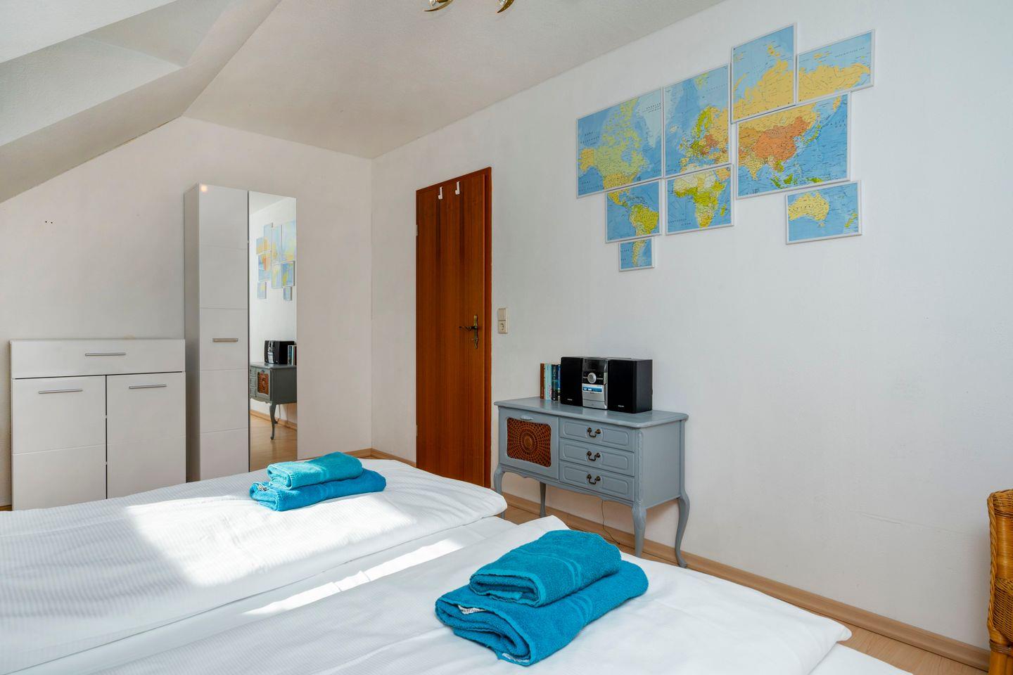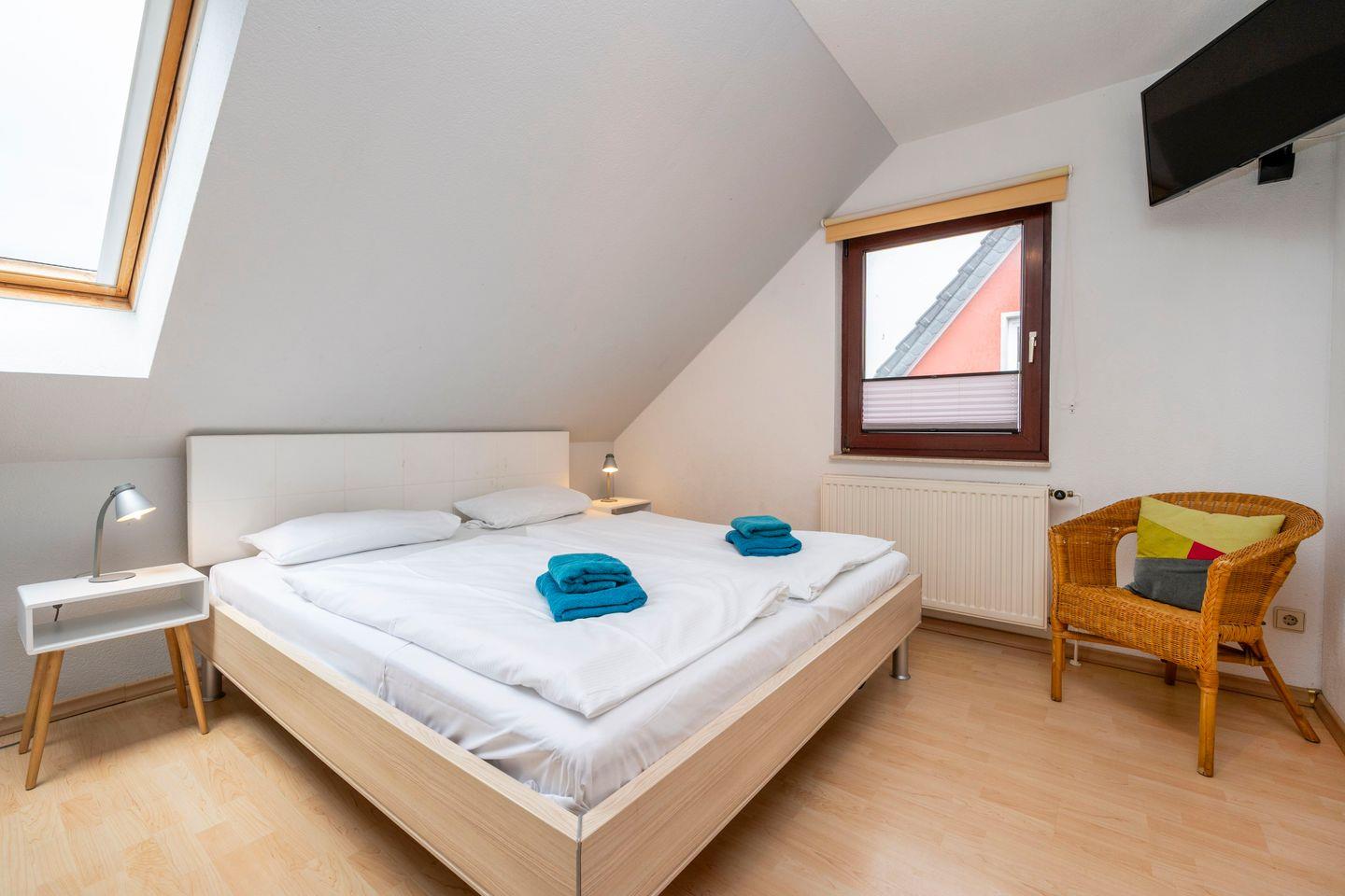 Die anderen drei Schlafzimmer liegen im Obergeschoss und sind ebenfalls mit Doppelbetten ausgestattet, in zwei Zimmern gibt es auch einen zusätzlichen Fernseher.