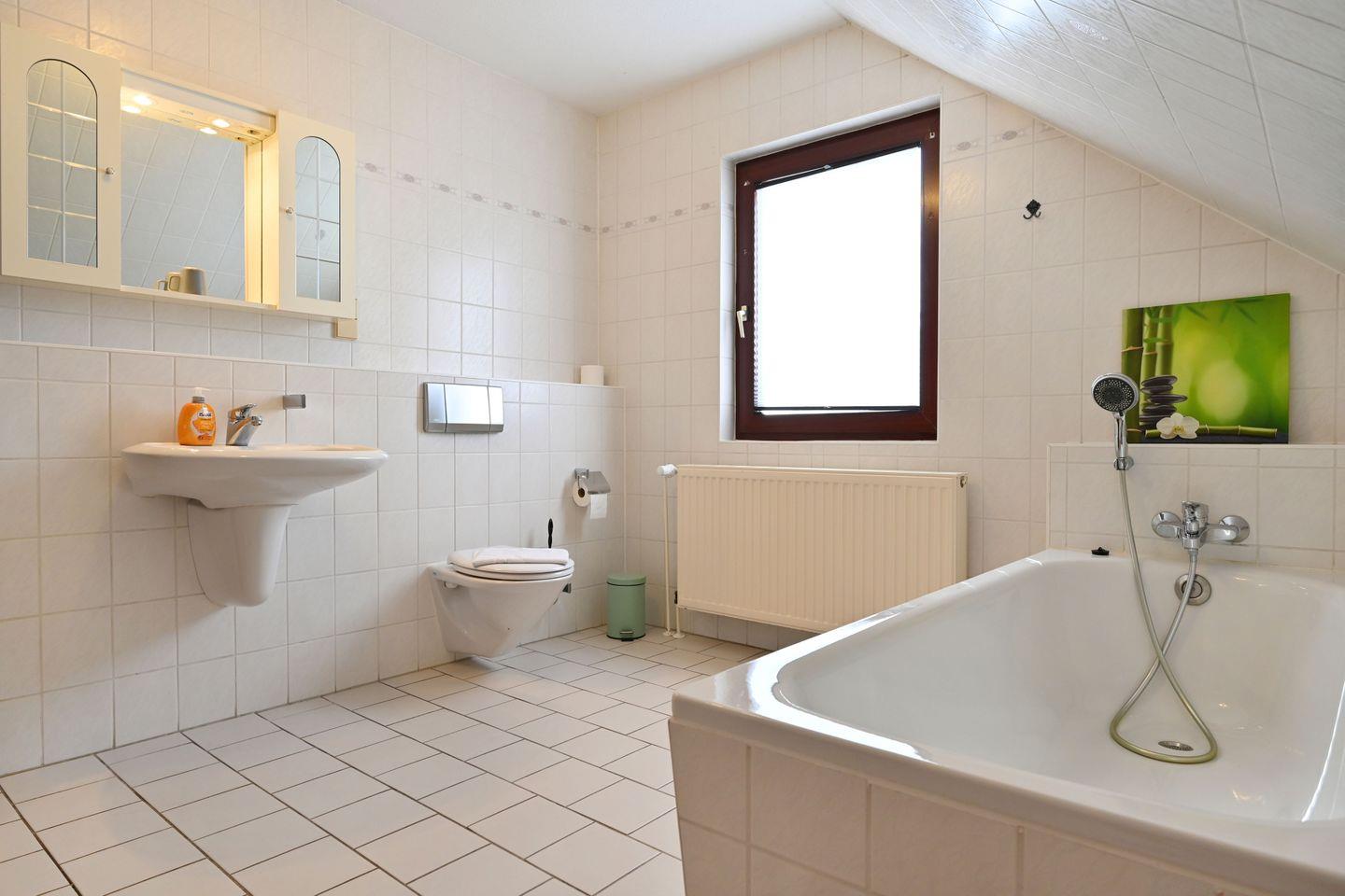 Das große Badezimmer verfügt über eine Badewanne und lädt zu einem Schaumbad ein.