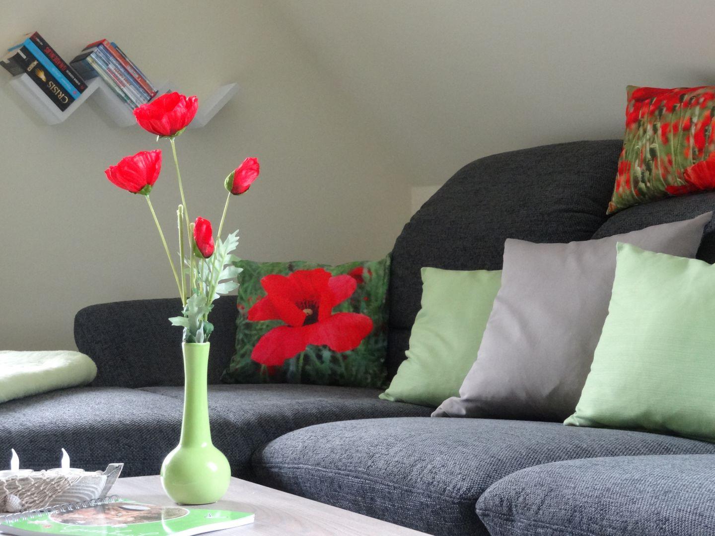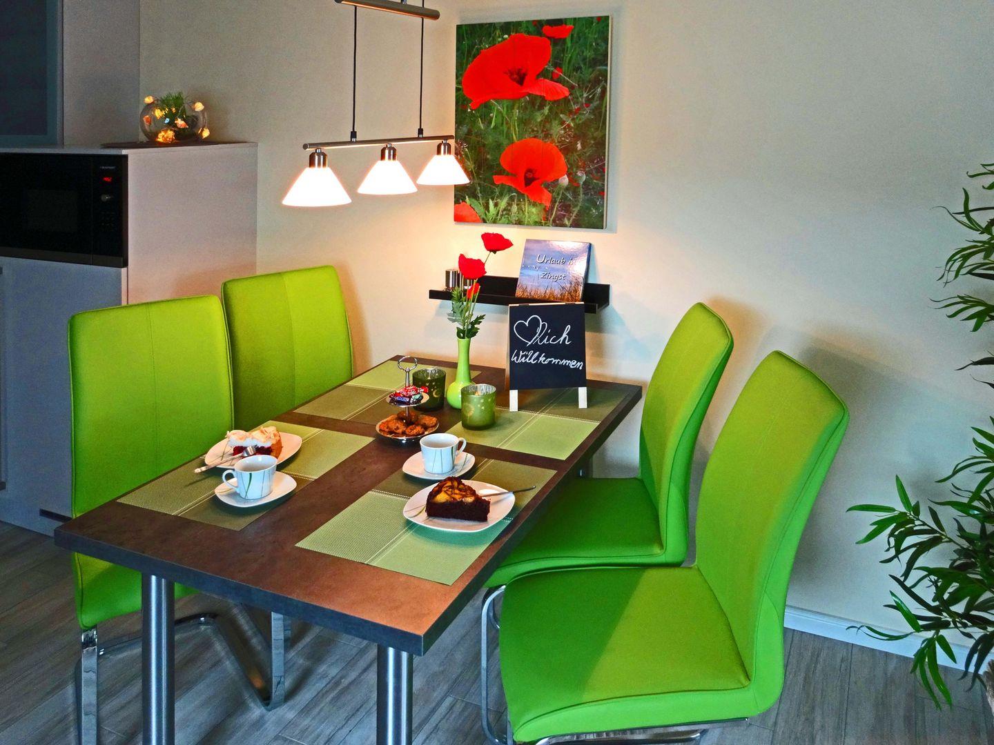 Ein großzügiger Wohn- und Essbereich mit Sofalandschaft, Blu-Ray-Player, SAT-TV und Stereoanlage sorgt für entspannte Abende. Die offene Küche ist umfassend eingerichtet: Cerankochfeld, Backofen, Mikrowelle, Geschirrspüler, Kühlschrank mit Gefrierfach und Kaffeemaschine sind vorhanden.