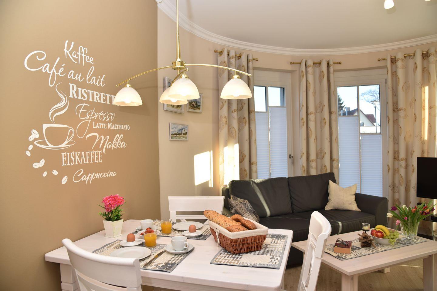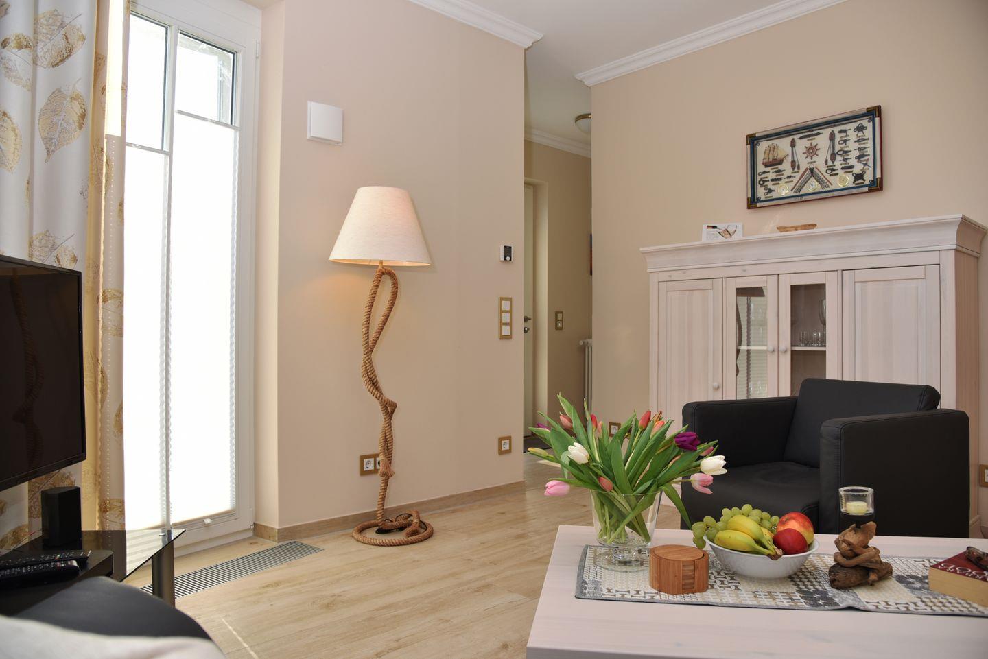 Willkommen in der Strandsuite Klaas Störtebecker, das Wohnzimmer mit Schlafsofa, Satelliten-TV, kostenloses W-LAN und HIFI-Anlage lädt zum gemütlichen Beisammensein ein.