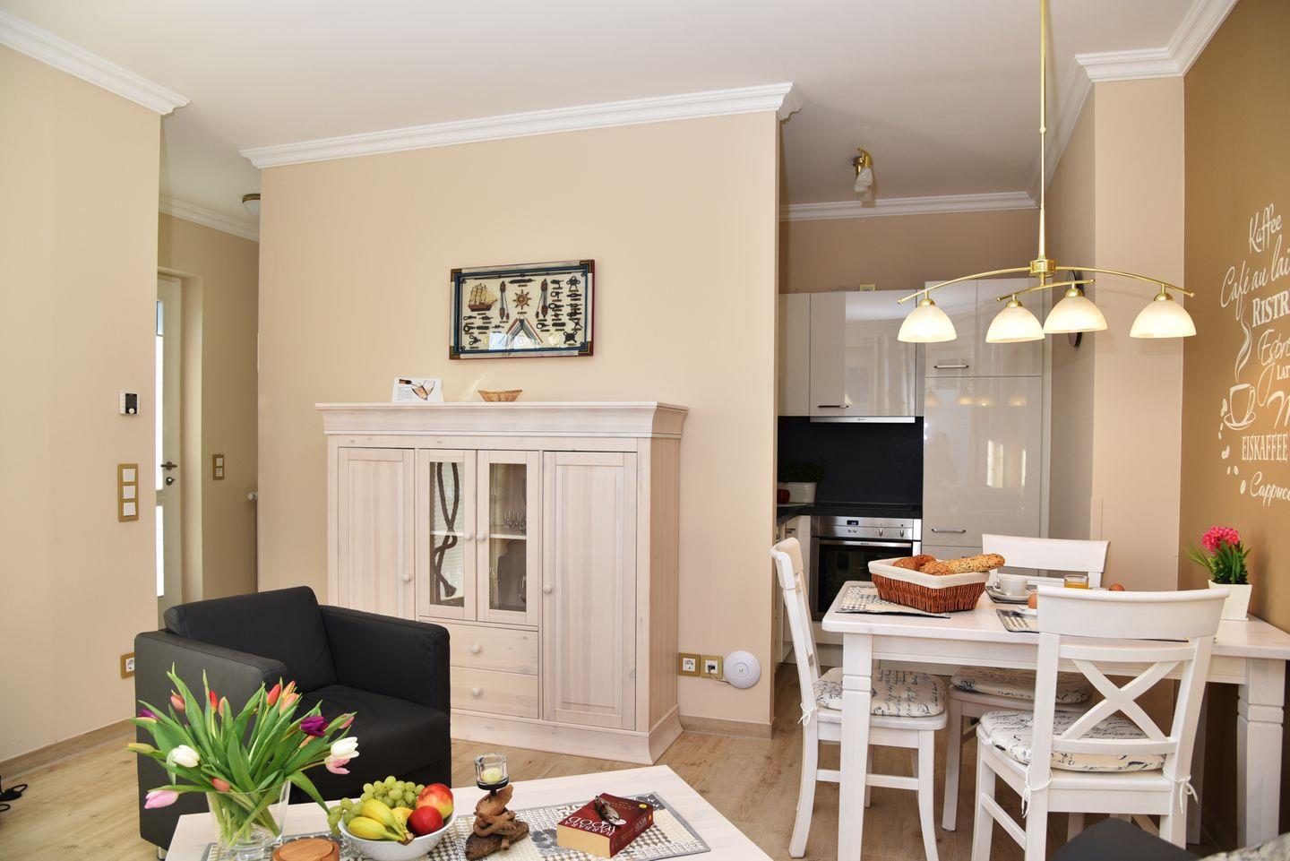 Das Wohnzimmer mit Schlafsofa, Satelliten-TV, und HIFI-Anlage lädt zum gemütlichen Beisammensein ein. Offene Küche mit Geschirrspüler, und Backofen, anschließend eine gemütliche Essecke.