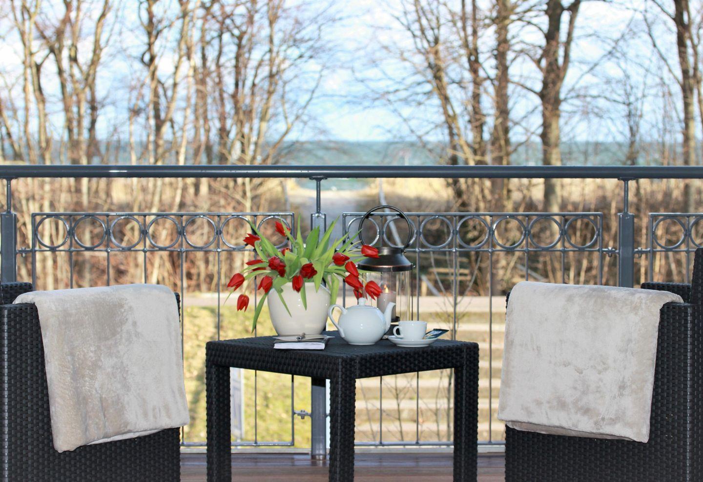 Sie genießen direkten Blick aus dem exklusiven Wohnbereich, aus dem eleganten Schlafbereich und vom großräumigen Balkon, zur Ostsee (Oktober - Mai) Genießen Sie das Rauschen der Wellen und den Duft den Meeres.