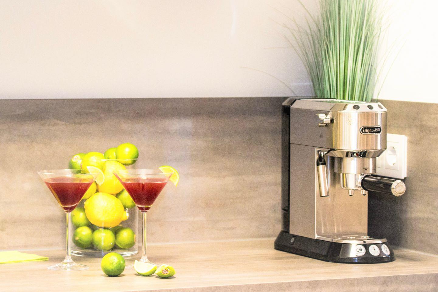 Ihre Suite ist ausgestattet mit einem exkluviven Wohnraum mit Flachbild TV, inkl. Designercouch und einer vollausgestatteten Einbauküche im weißen Lack.