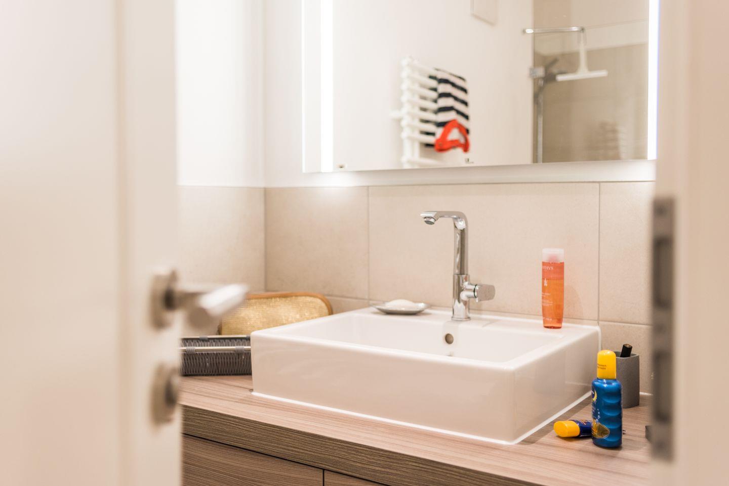 Im Bad befindet sich eine große bodengleicht Dusche.