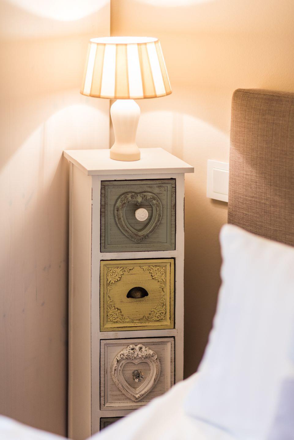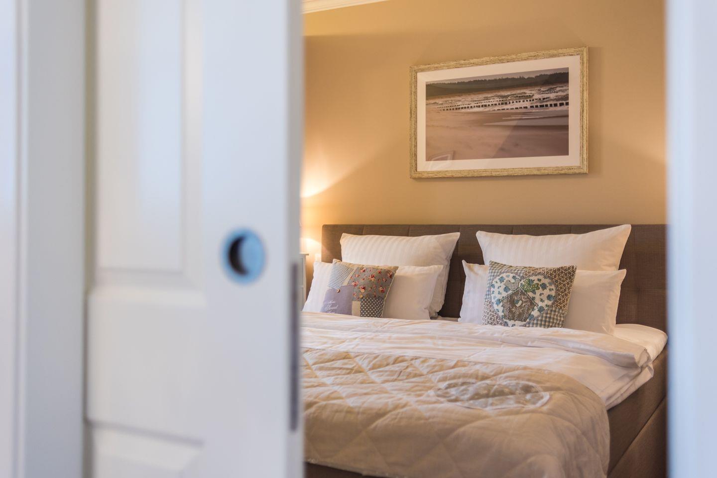 Das Schlafzimmer ist ausgestattet mit einem bequemen Boxspringbett.