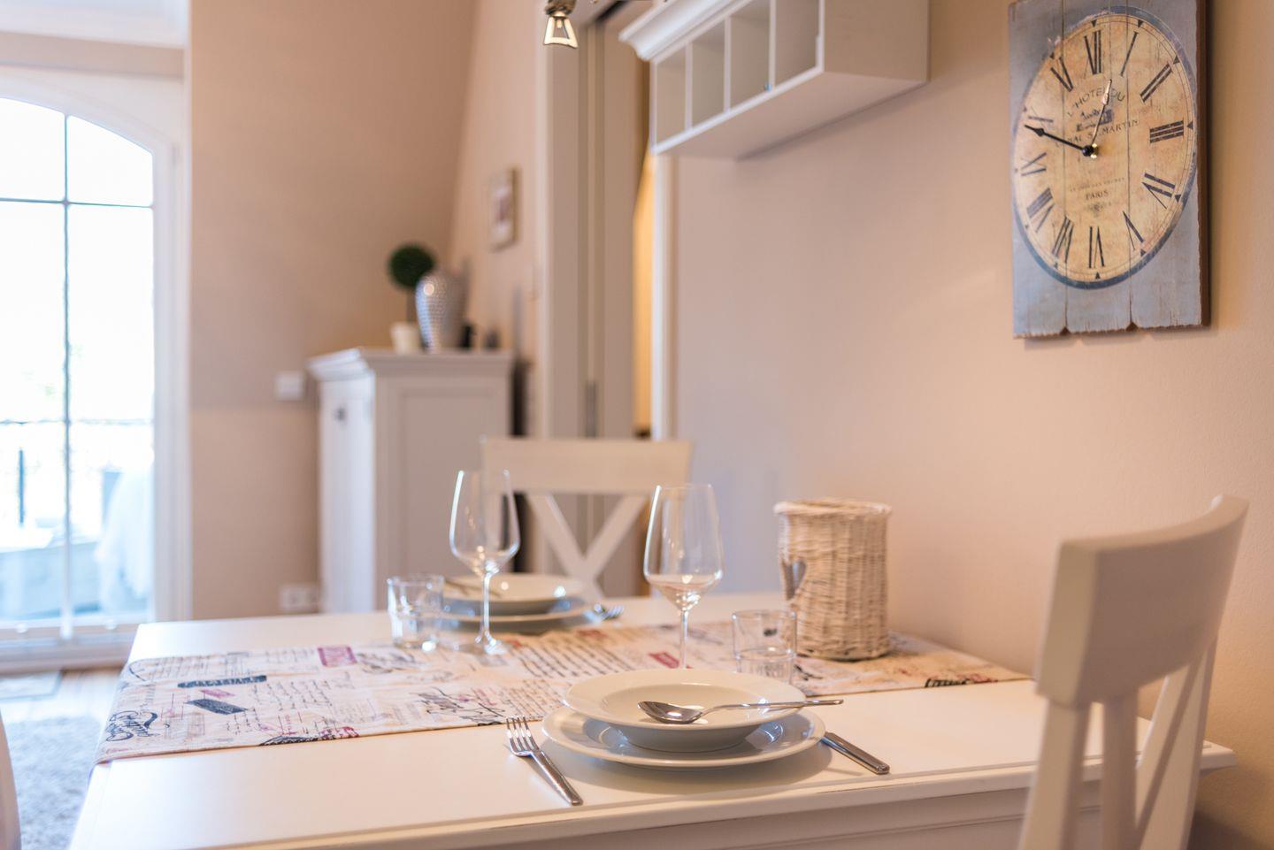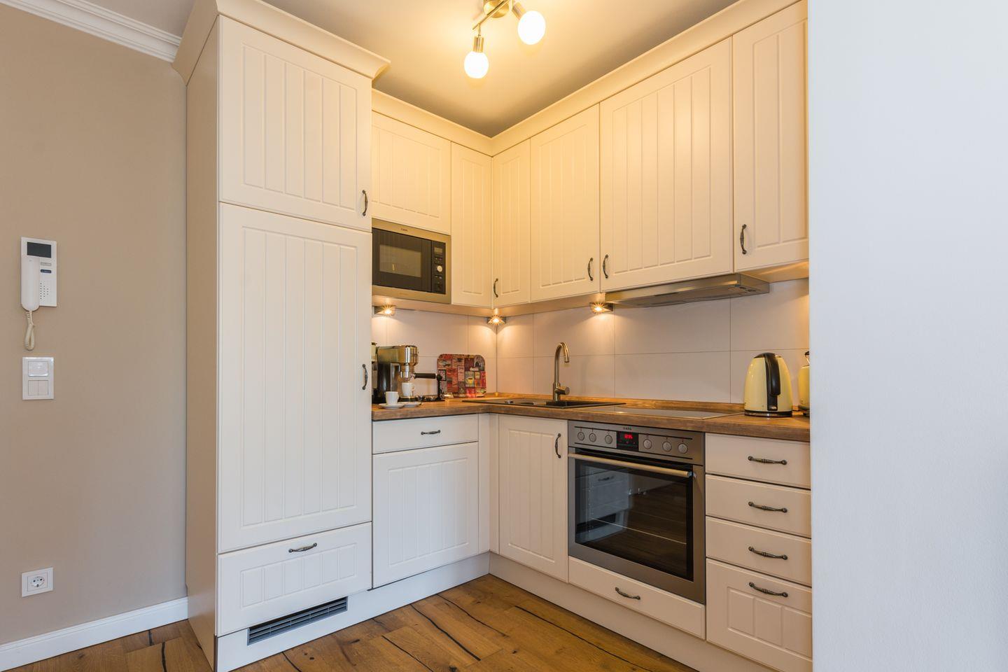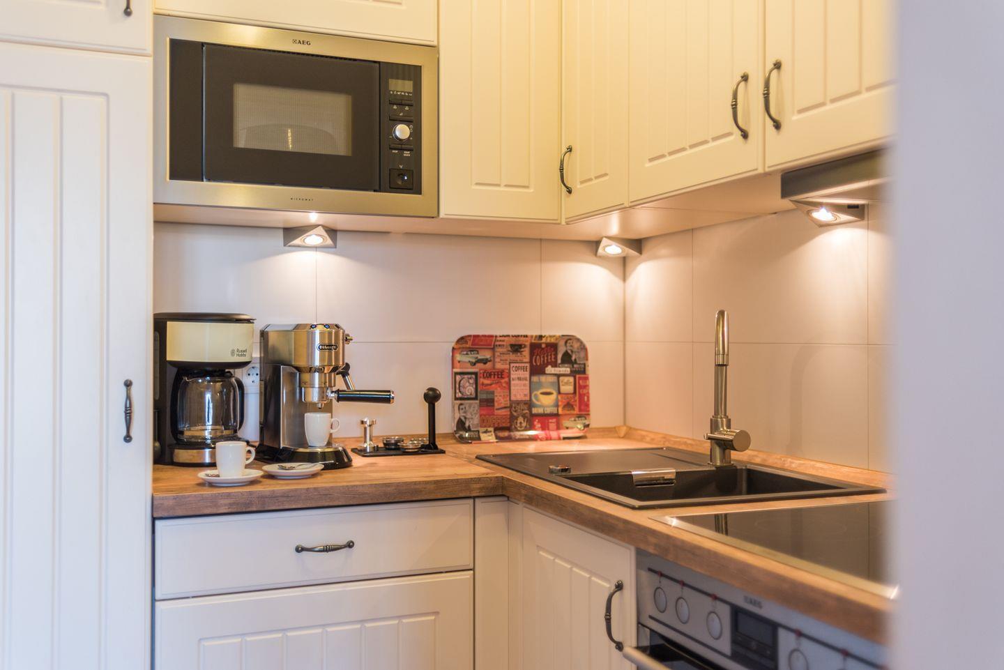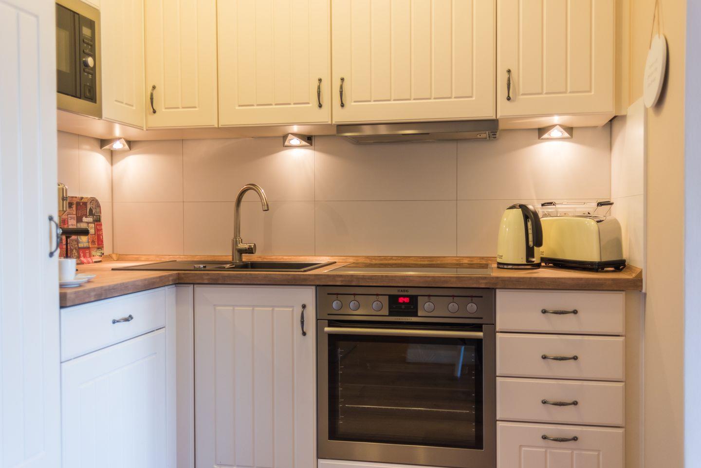 In der komfortabel eingerichteten Ferienwohnung erwartet Sie neben dem Flat-TV mit Blueray-Player eine vollausgestattete Einbauküche (Cerankochfeld, Backofen, Mikrowelle, Kühlschrank mit Gefrierfach, Geschirrspülmaschine und Wasserkocher).