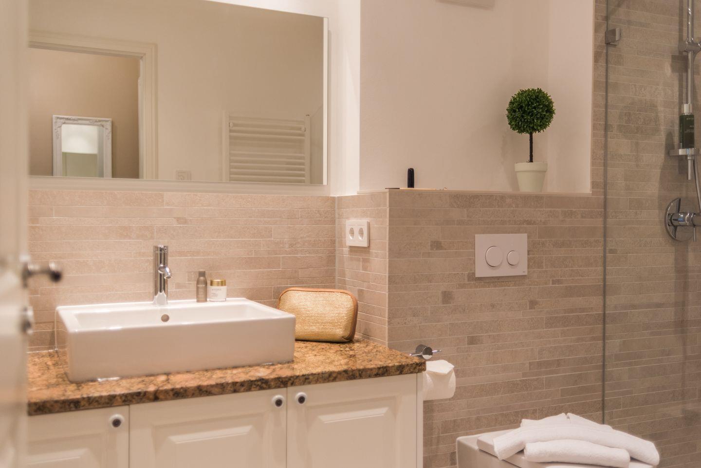 Das großzügige Badezimmer verfügt über eine bodengleiche Dusche und einen Handtuchheizkörper.