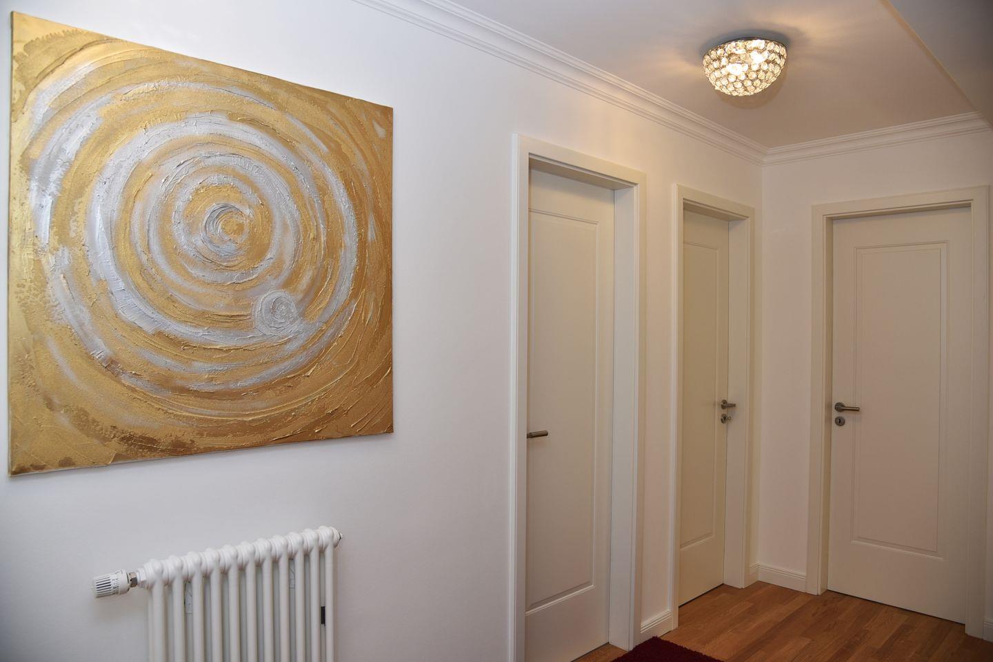 Das Badezimmer mit ebenerdiger Dusche, Handtuchtrockner, WC und genügend Stauraum bietet ausreichend Platz.