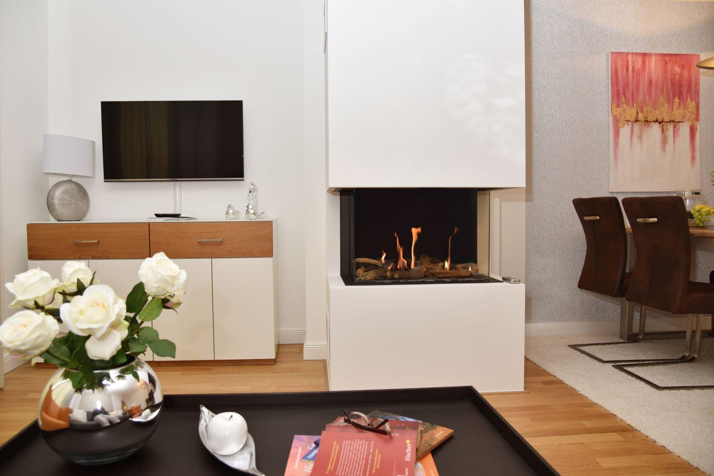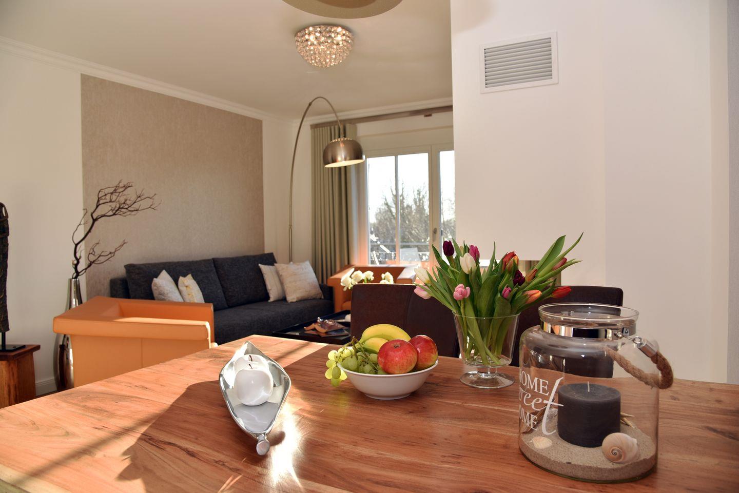 In der neu errichteten Suite in direkter Strandlage befindet sich der lichtdurchflutete Wohnbereich mit Couch- und Essecke und einer komfortabel ausgestatteten Küchenzeile.