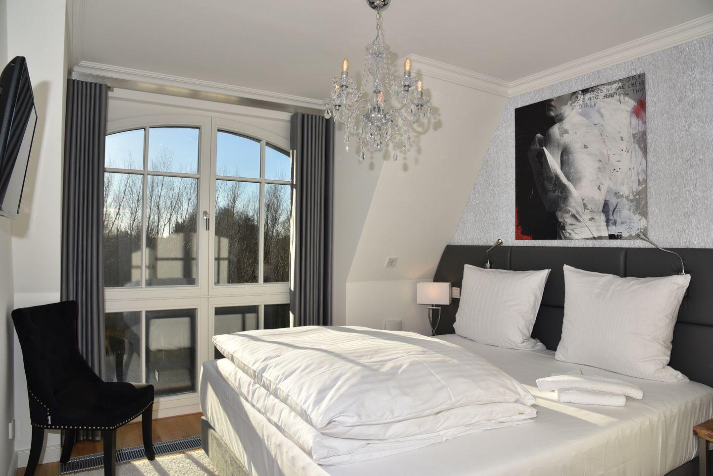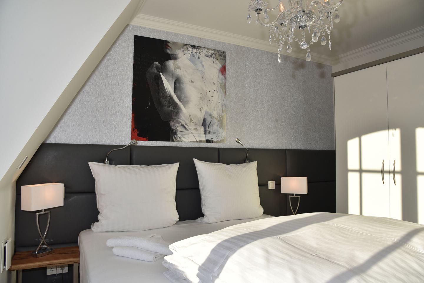Zum Schlafen bietet die Suite ein Schlafzimmer mit Boxspringbett und ein Kinderzimmer mit Einzelbett sowie Doppelschlafcouch.