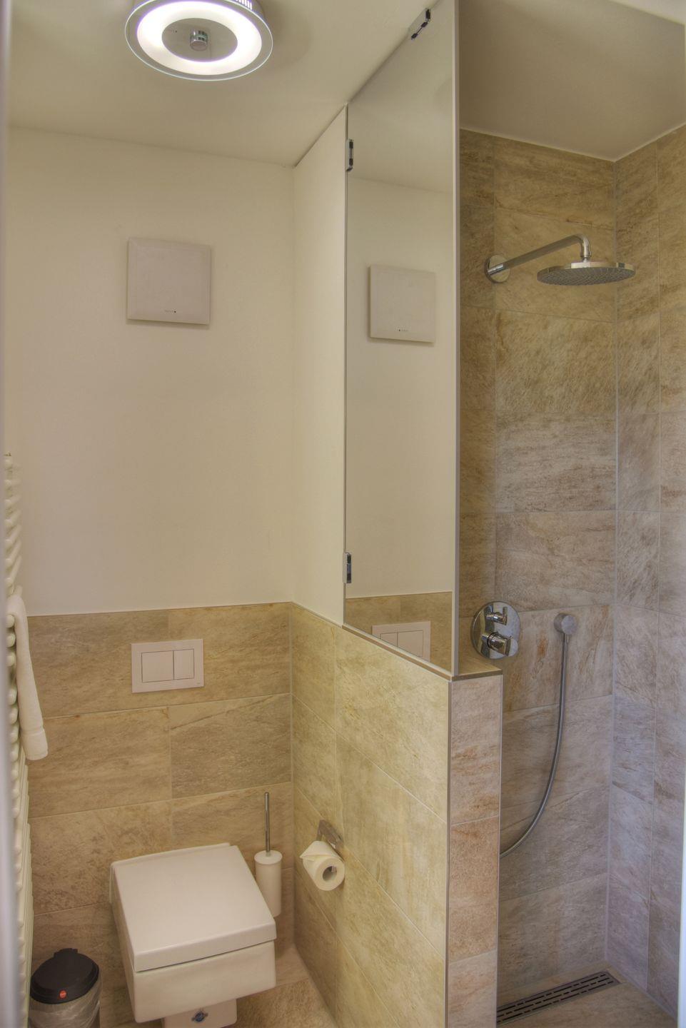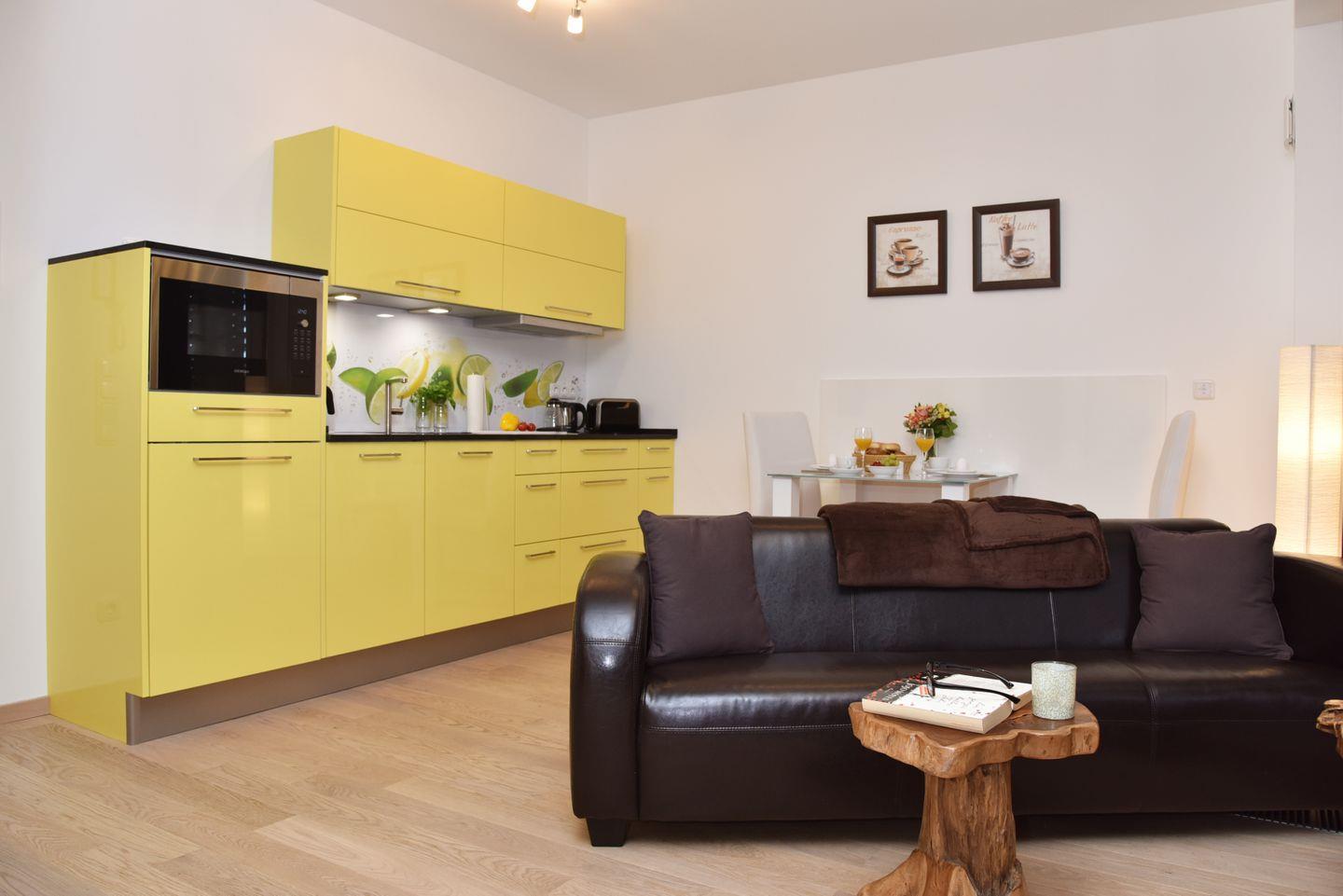 Zur Suite gehört eine neu ausgestattete Küchenzeile, ein Bad mit ebenerdiger Dusche und der offene Schlafbereich mit Boxspringbetten.