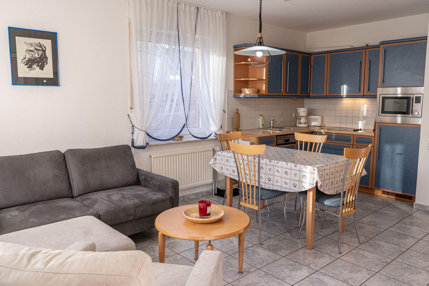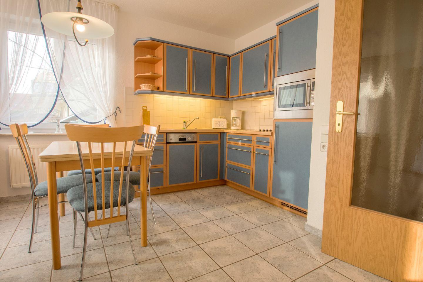 Die vollständig ausgestattete Küche (ohne Backofen) ist in den Wohnbereich integriert.