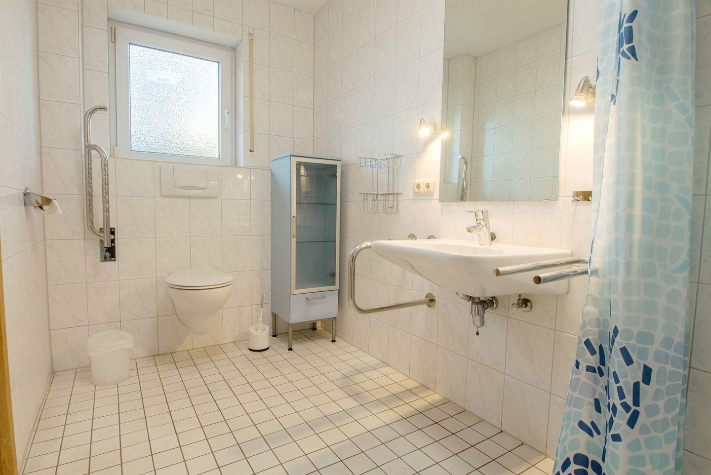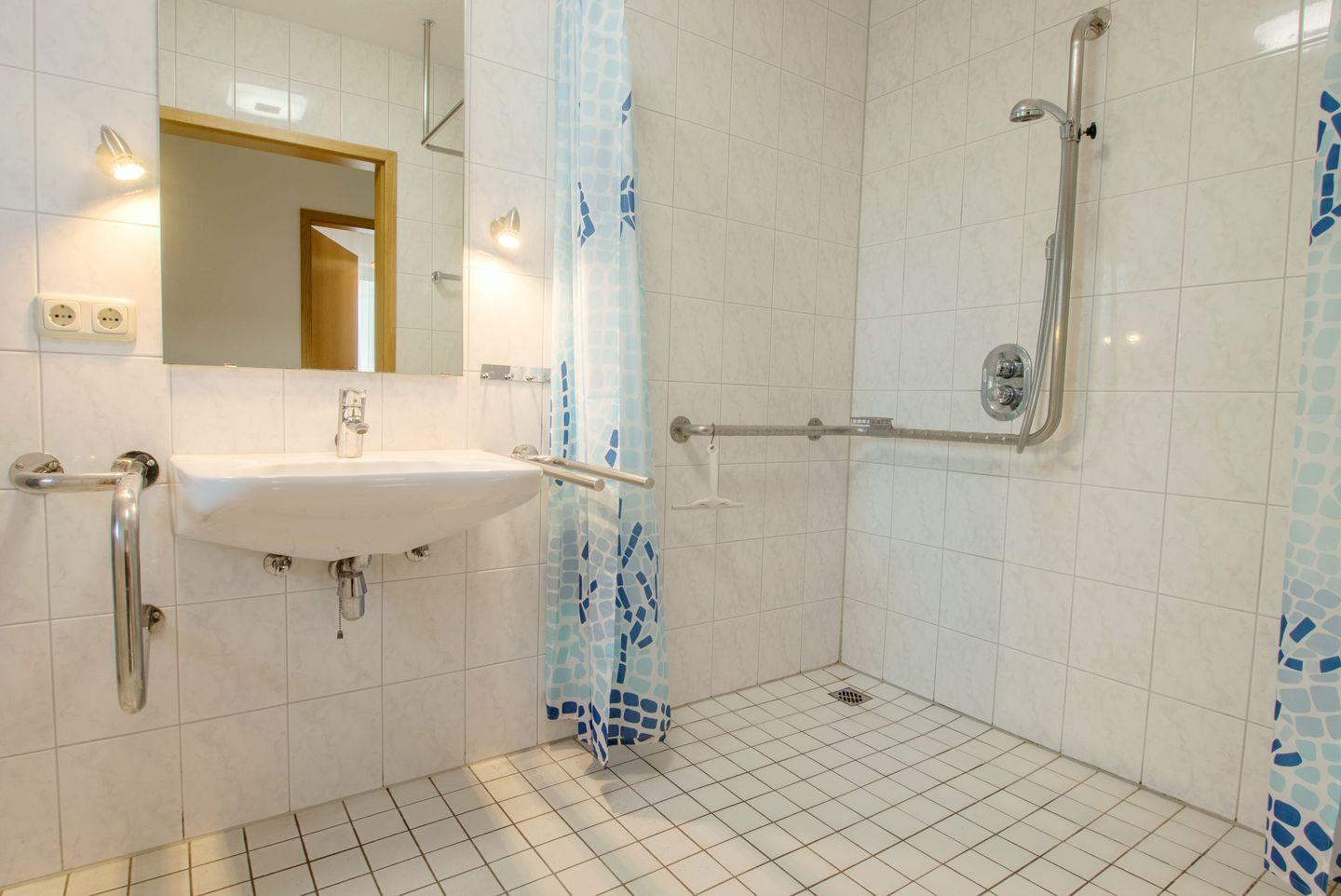 Das Bad ist mit einer behindertenfreundlichen Dusche und Toilette ausgestattet.