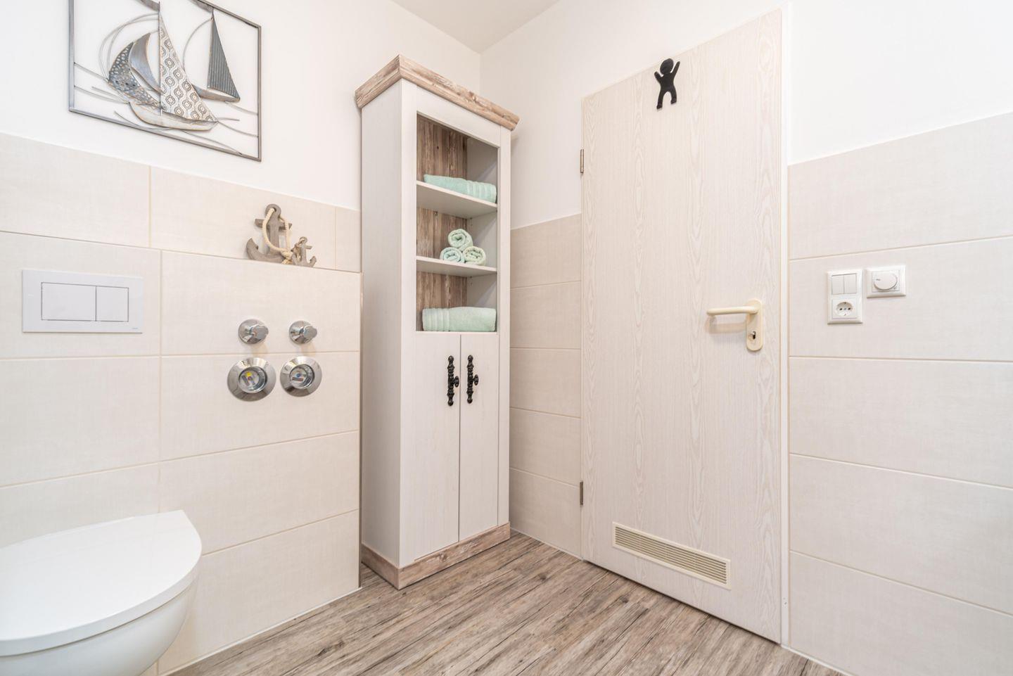 Das Badezimmer verfügt über Ablagemöglichkeiten, eine Dusche und WC.