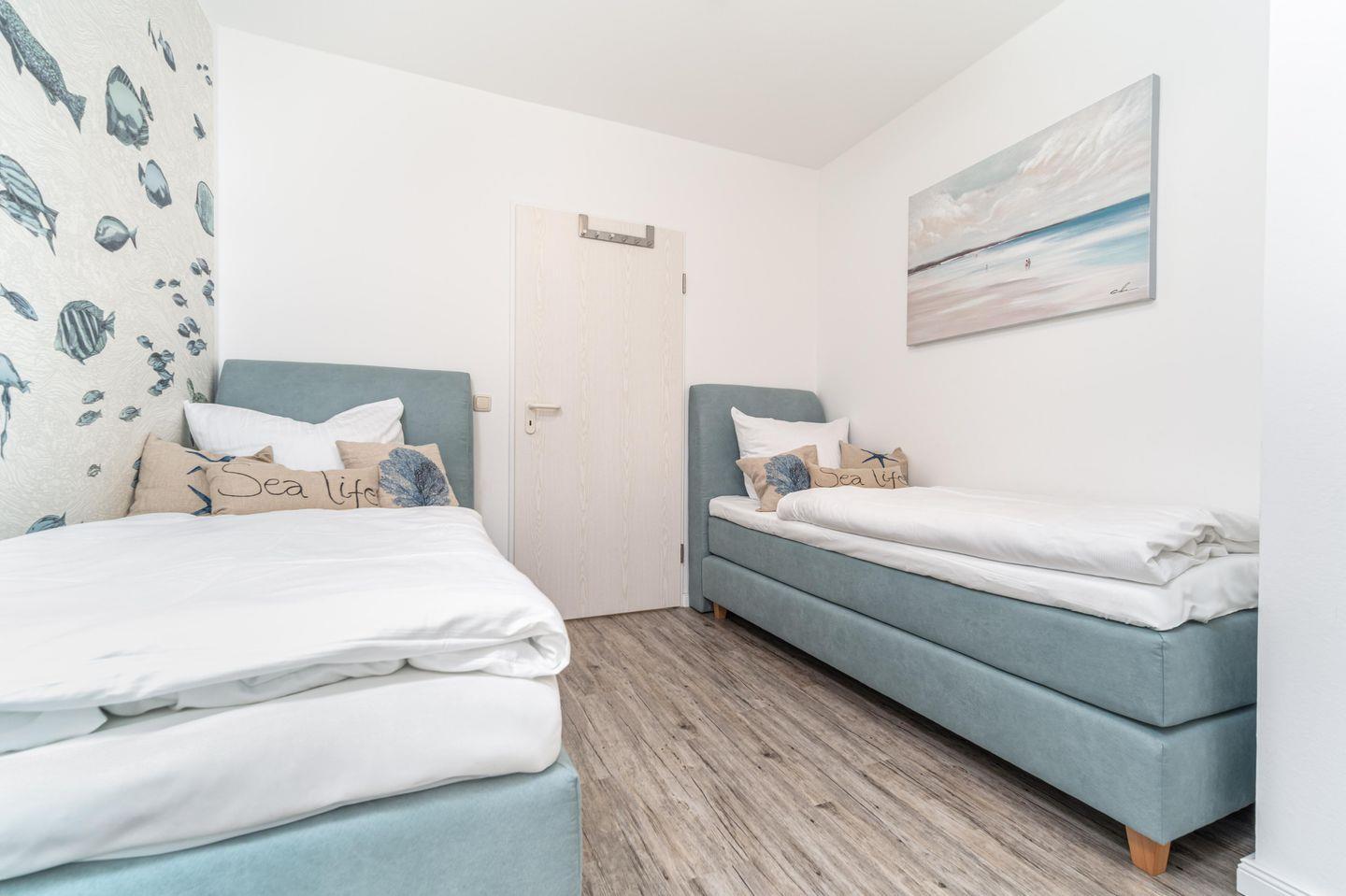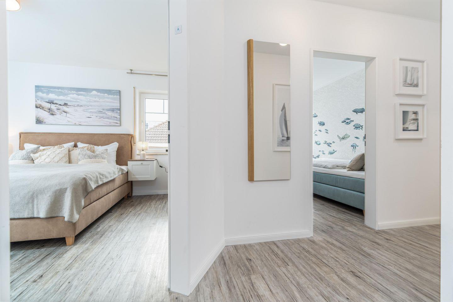 Ein Schlafzimmer mit Doppelbett sowie ein weiteres mit zwei Einzelbetten bieten einen ruhigen Schlaf.
