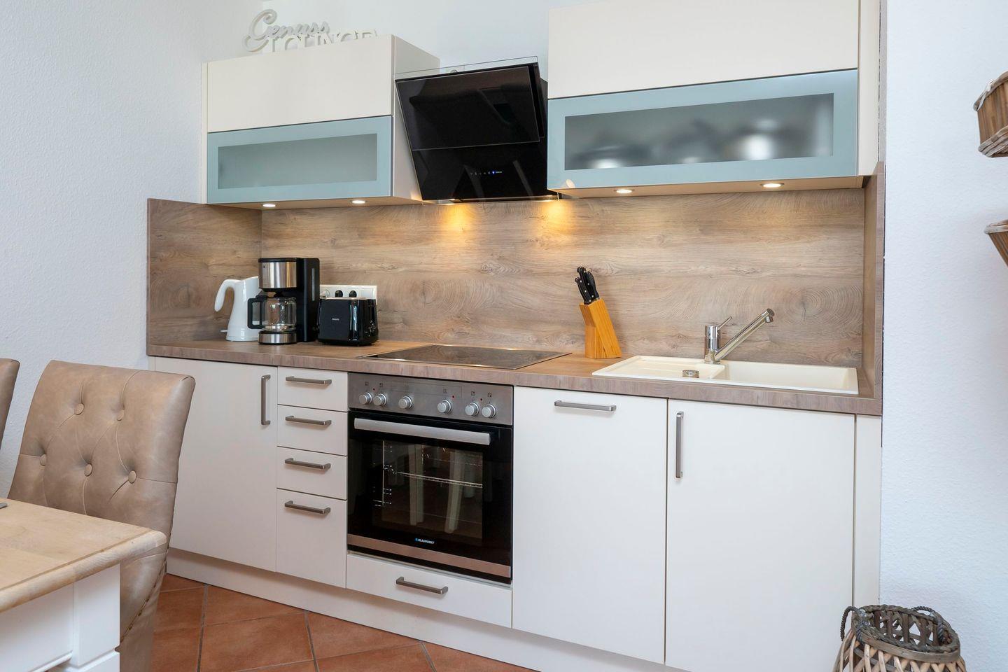 Die 2-Zimmer-Ferienwohnung wurde im Februar 2017 renoviert und liebevoll im maritimen Stil neu ausgestattet. Das großzügige Wohnzimmer ist mit einer Eck-Couch (mit Schlafmöglichkeit) eingerichtet und schließt an die moderne offene Küche mit stilvollem Essbereich an. Die Küche selbst bietet Kühlschrank, Backofen, Cerankochfeld, Kaffeemaschine und Geschirrspüler. Hier kann man sich ganz zu Hause fühlen.