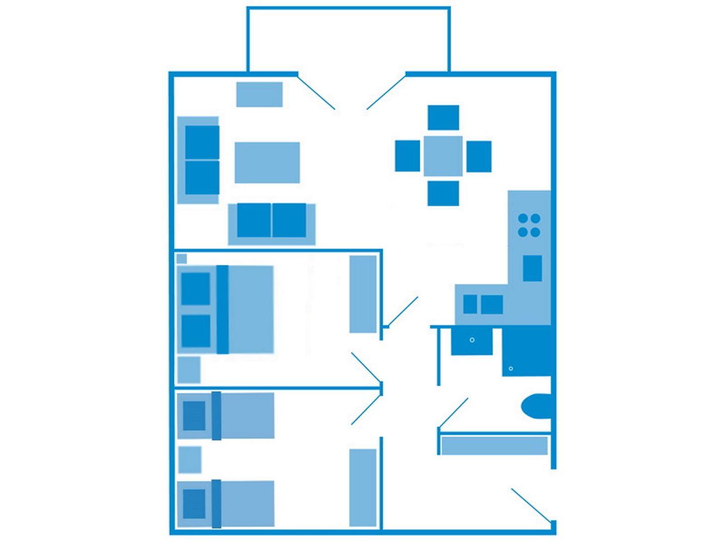 Die Wohnung verfügt über 63 m². Sie bietet Platz für 4 Personen die sich in zwei Schlafräumen (1x Doppelbett und 1x 2 Einzelbetten) aufteilen können.