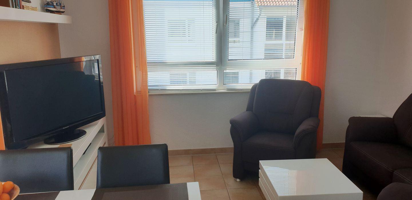 Das Wohnzimmer mit seinem gemütlichen Sofa und zwei Sesseln sowie dem Sat-TV und Radio lädt zum Verweilen ein.