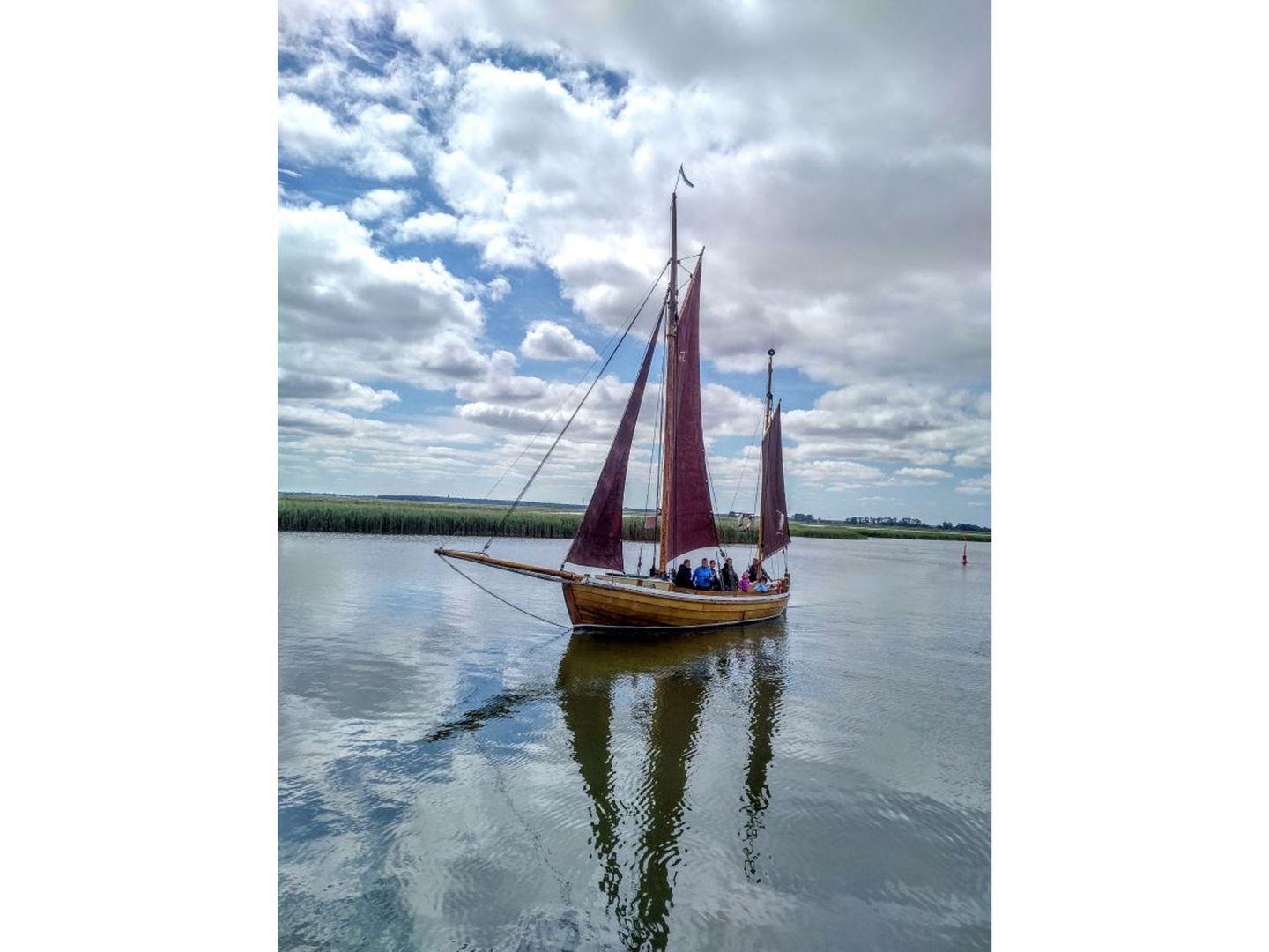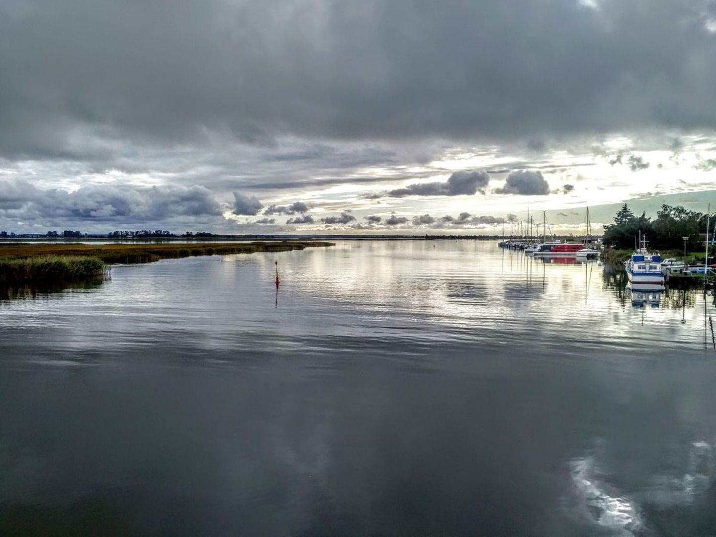 Auf dem großzügigen Balkon können Sie vom ersten Sonnenstrahl am Morgen bis zum späten Abend den freien Blick in Richtung Bodden genießen.