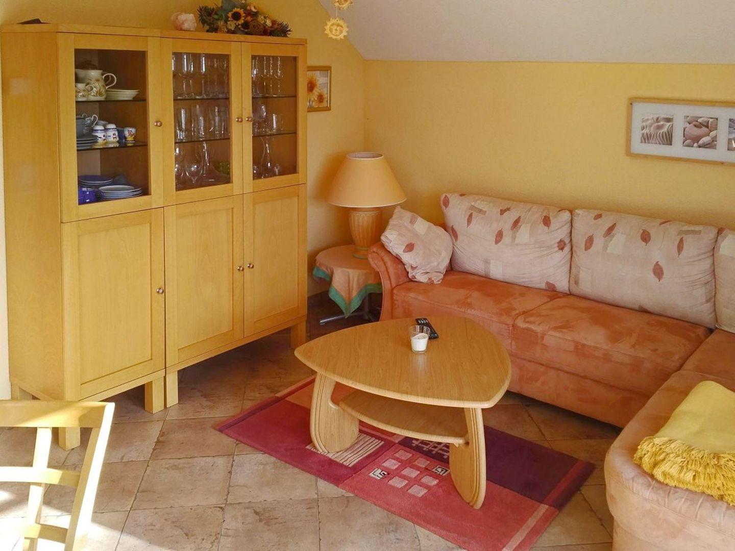 Im lichtdurchfluteten Wohnzimmer befindet sich eine gemütliche Polstergarnitur.