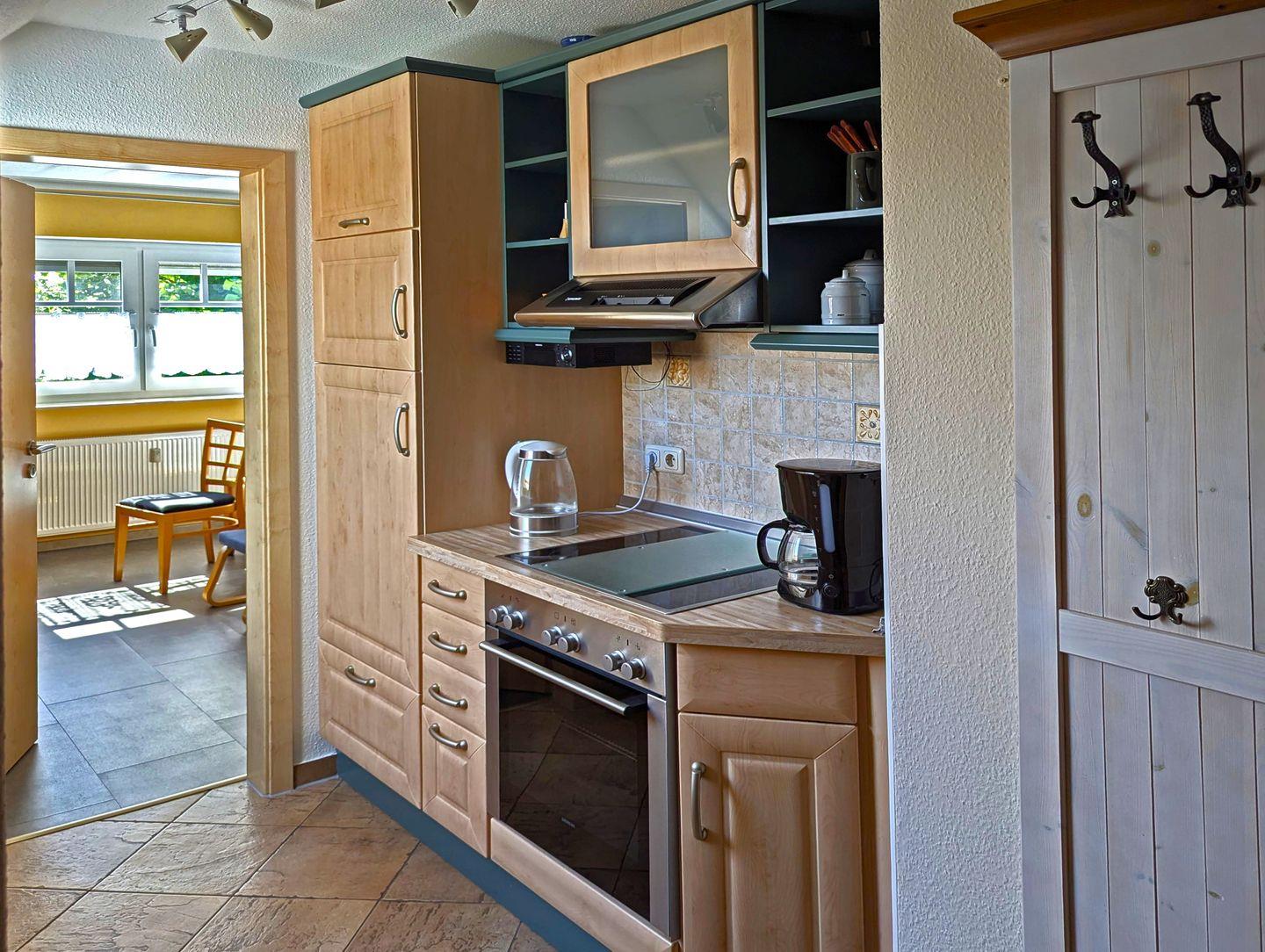 Die komplett ausgestattete Einbauküche im Flur verfügt über Geschirrspüler, Herd/Backofen, Mikrowelle, Kühlschrank mit Gefrierfach, Kaffeemaschine und Toaster.